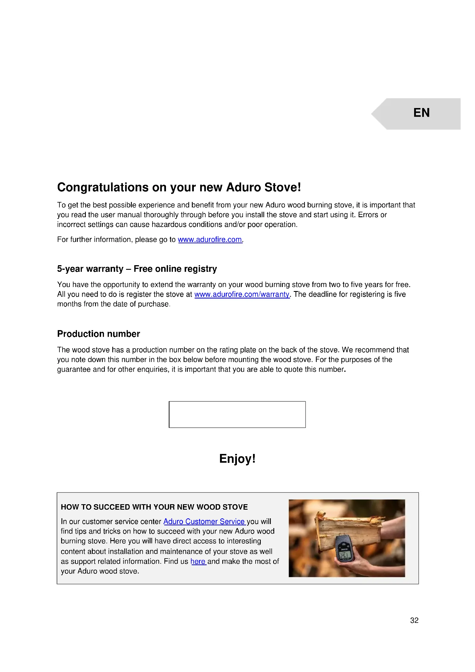 Congratulations on your new Aduro Stove! To get the best possible experience and benefit from your new Aduro wood burning stove, it is important that you read the user manual thoroughly through before you install the stove and start using it. Errors or incorrect settings can cause hazardous conditions and/or poor operation. For further information, please go to www.adurofire.com. 5-year warranty – Free online registry You have the opportunity to extend the warranty on your wood burning stove from two to five years for free. All you need to do is register the stove at www.adurofire.com/warranty. The deadline for registering is five months from the date of purchase. Production number The wood stove has a production number on the rating plate on the back of the stove. We recommend that you note down this number in the box below before mounting the wood stove. For the purposes of the guarantee and for other enquiries, it is important that you are able to quote this number.