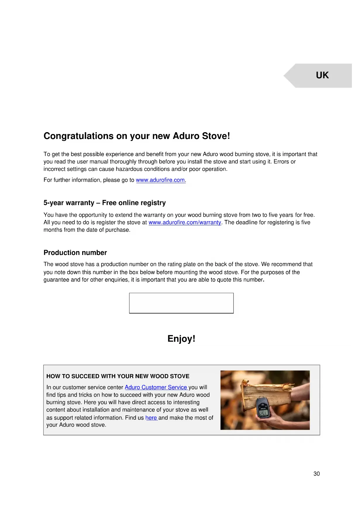 Congratulations on your new Aduro Stove! To get the best possible experience and benefit from your new Aduro wood burning stove, it is important that you read the user manual thoroughly through before you install the stove and start using it. Errors or incorrect settings can cause hazardous conditions and/or poor operation. For further information, please go to www.adurofire.com. 5-year warranty – Free online registry You have the opportunity to extend the warranty on your wood burning stove from two to five years for free. All you need to do is register the stove at www.adurofire.com/warranty. The deadline for registering is five months from the date of purchase. Production number The wood stove has a production number on the rating plate on the back of the stove. We recommend that you note down this number in the box below before mounting the wood stove. For the purposes of the guarantee and for other enquiries, it is important that you are able to quote this number.