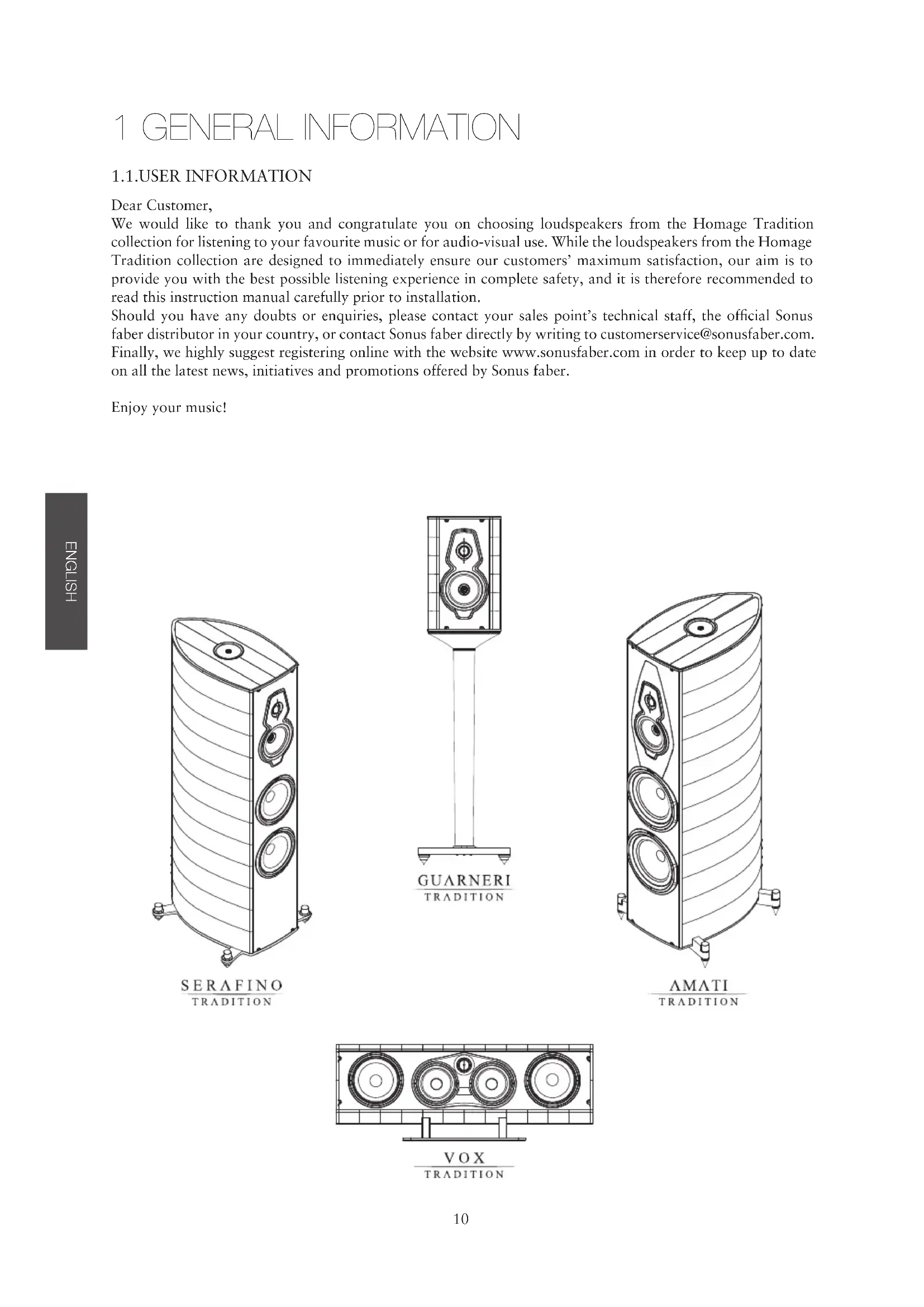 5 SMALTIMENTO Rischio di danni al mobile dell’apparecchio! Non usare prodotti per la pulizia, cere per mobili, liquidi detergenti o alcool. Non usare panni ruvidi. Questo apparecchio contiene materiali che possono inquinare se dispersi nell’ambiente. Consegnare l’apparecchio da smaltire ad un centro per la raccolta differenziata. ITALIANO10 1 GENERAL INFORMATION Dear Customer, We would like to thank you and congratulate you on choosing loudspeakers from the Homage Tradition collection for listening to your favourite music or for audio-visual use. While the loudspeakers from the Homage Tradition collection are designed to immediately ensure our customers’ maximum satisfaction, our aim is to provide you with the best possible listening experience in complete safety, and it is therefore recommended to read this instruction manual carefully prior to installation. Should you have any doubts or enquiries, please contact your sales point’s technical staff, the official Sonus faber distributor in your country, or contact Sonus faber directly by writing to customerservice@sonusfaber.com. Finally, we highly suggest registering online with the website www.sonusfaber.com in order to keep up to date on all the latest news, initiatives and promotions offered by Sonus faber. Enjoy your music!