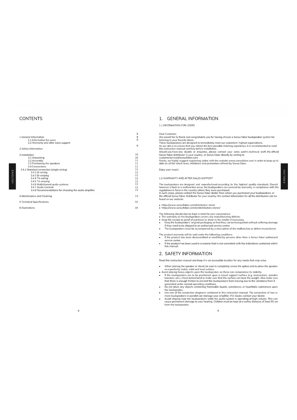 Dear Customer, We would like to thank and congratulate you for having chosen a Sonus faber loudspeaker system for listening to your favorite Music. These loudspeakers are designed to immediately meet our customers’ highest expectations. As our aim is to ensure that you obtain the best possible listening experience, it is recommended to read this instruction manual carefully before installation. Should you have any doubts or enquiries, please contact your sales point’s technical staff, the ofcial Sonus faber distributor in your country, or Sonus faber directly by writing to customerservice@sonusfaber.com. Finally, we highly suggest registering online with the website www.sonusfaber.com in order to keep up to date on all the latest news, initiatives and promotions offered by Sonus faber. Enjoy your music!