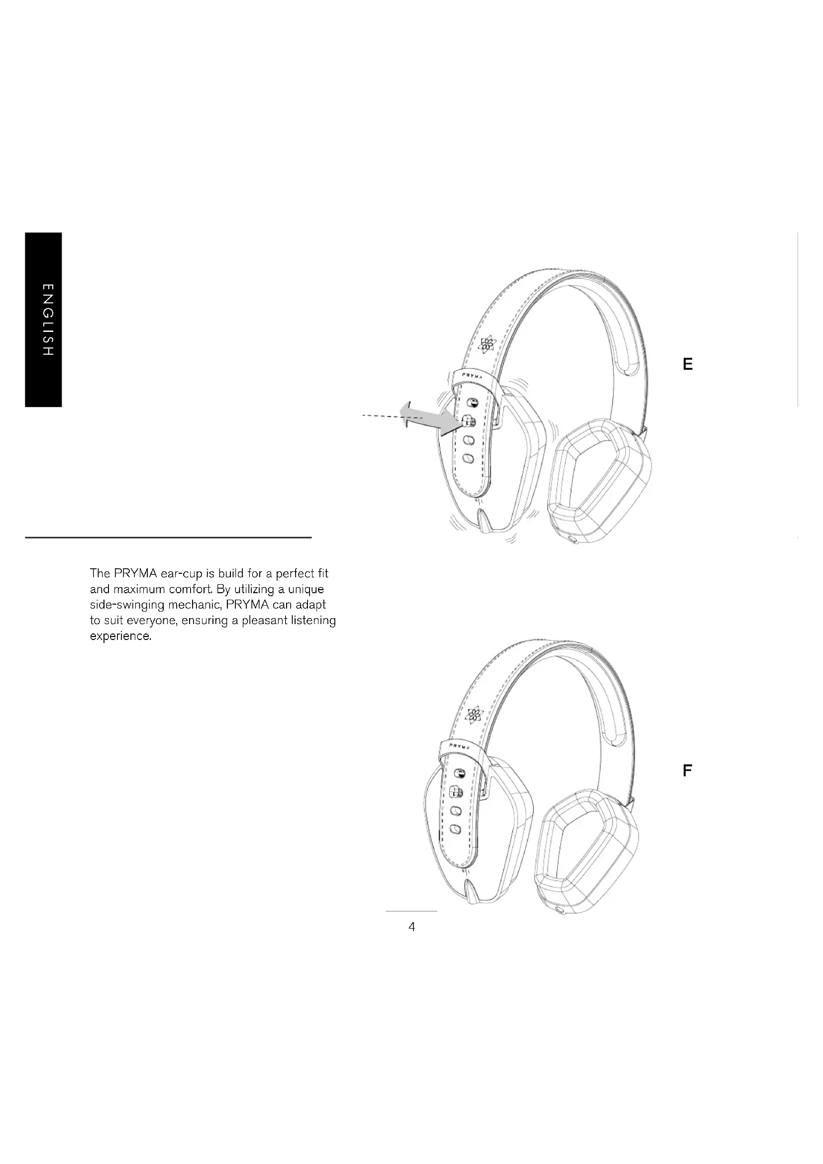The PRYMA ear-cup is build for a perfect fit and maximum comfort. By utilizing a unique side-swinging mechanic, PRYMA can adapt to suit everyone, ensuring a pleasant listening experience.5 ENGLISH