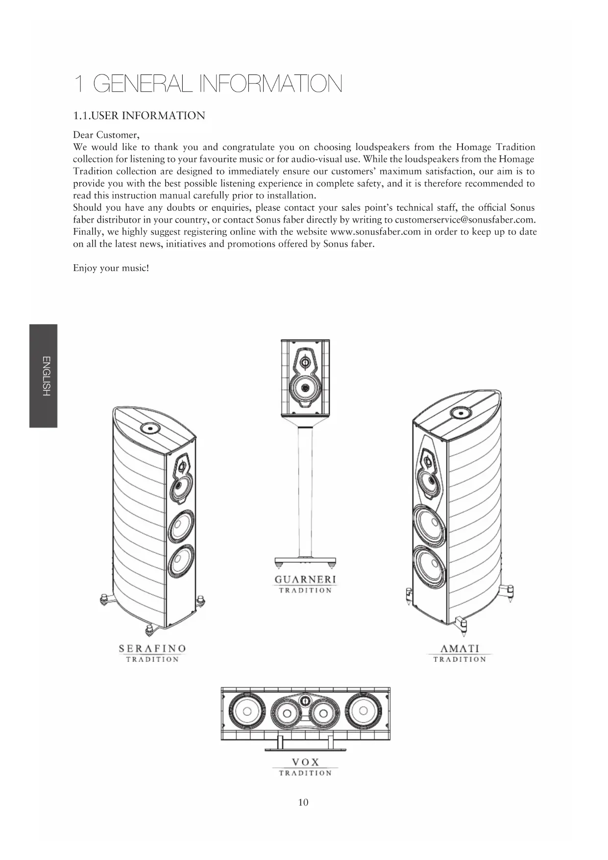 Should you have any doubts or enquiries, please contact your sales point's technical staff, the official Sonus faber distributor in your country, or contact Sonus faber directly by writing to customerservice@sonusfaber.com. Finally, we highly suggest registering online with the website www.sonusfaber.com in order to keep up to date on all the latest news, initiatives and promotions offered by Sonus faber.