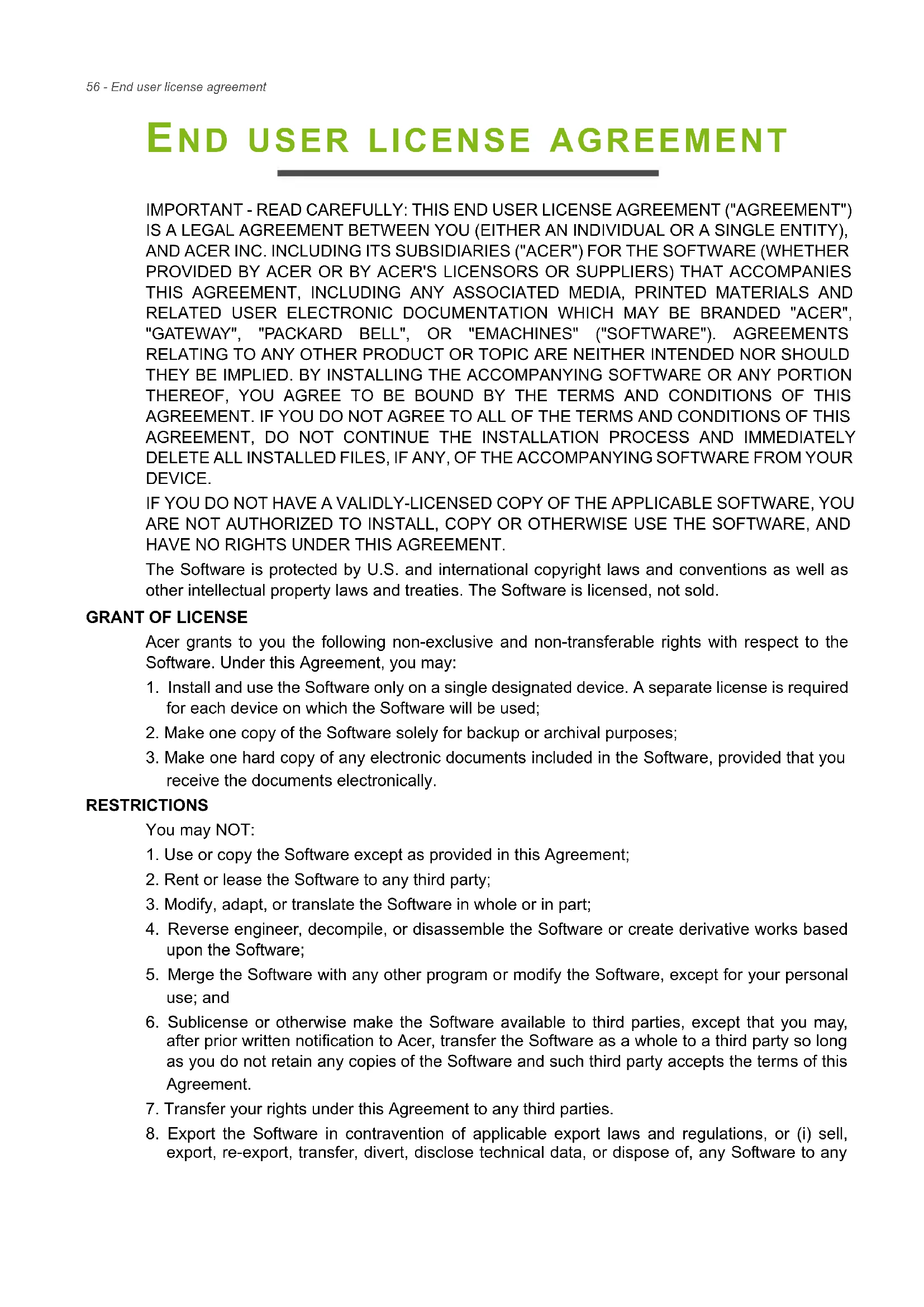 IMPORTANT - READ CAREFULLY: THIS END USER LICENSE AGREEMENT ("AGREEMENT") IS A LEGAL AGREEMENT BETWEEN YOU (EITHER AN INDIVIDUAL OR A SINGLE ENTITY), AND ACER INC. INCLUDING ITS SUBSIDIARIES ("ACER") FOR THE SOFTWARE (WHETHER PROVIDED BY ACER OR BY ACER'S LICENSORS OR SUPPLIERS) THAT ACCOMPANIES THIS AGREEMENT, INCLUDING ANY ASSOCIATED MEDIA, PRINTED MATERIALS AND RELATED USER ELECTRONIC DOCUMENTATION WHICH MAY BE BRANDED "ACER", "GATEWAY", "PACKARD BELL", OR "EMACHINES" ("SOFTWARE"). AGREEMENTS RELATING TO ANY OTHER PRODUCT OR TOPIC ARE NEITHER INTENDED NOR SHOULD THEY BE IMPLIED. BY INSTALLING THE ACCOMPANYING SOFTWARE OR ANY PORTION THEREOF, YOU AGREE TO BE BOUND BY THE TERMS AND CONDITIONS OF THIS AGREEMENT. IF YOU DO NOT AGREE TO ALL OF THE TERMS AND CONDITIONS OF THIS AGREEMENT, DO NOT CONTINUE THE INSTALLATION PROCESS AND IMMEDIATELY DELETE ALL INSTALLED FILES, IF ANY, OF THE ACCOMPANYING SOFTWARE FROM YOUR DEVICE. IF YOU DO NOT HAVE A VALIDLY-LICENSED COPY OF THE APPLICABLE SOFTWARE, YOU ARE NOT AUTHORIZED TO INSTALL, COPY OR OTHERWISE USE THE SOFTWARE, AND HAVE NO RIGHTS UNDER THIS AGREEMENT. The Software is protected by U.S. and international copyright laws and conventions as well as other intellectual property laws and treaties. The Software is licensed, not sold.