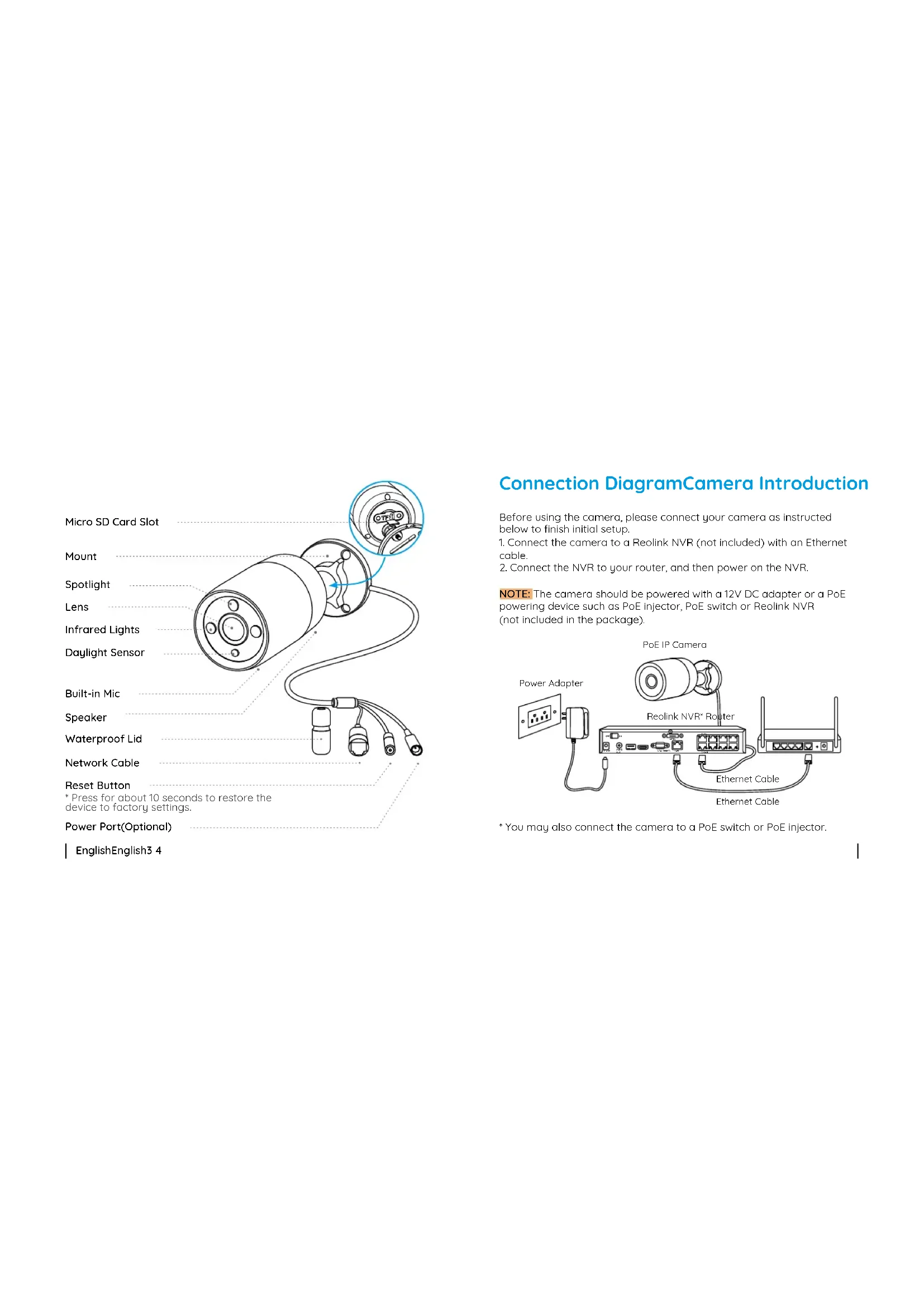 - You may also connect the camera to a PoE switch or PoE injector. NOTE: The camera should be powered with a 12V DC adapter or a PoE powering device such as PoE injector, PoE switch or Reolink NVR (not included in the package). PoE IP Camera Ethernet Cable Reolink NVR* Router Ethernet Cable Power Adapter Mount Micro SD Card Slot Spotlight Daylight Sensor Infrared Lights Lens Built-in Mic Speaker Waterproof Lid Network Cable Reset Button Power Port(Optional)