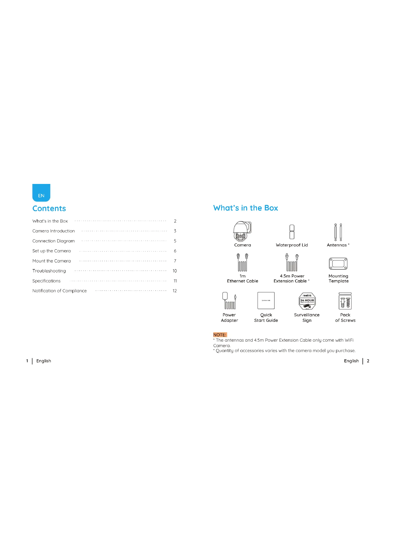 Ethernet Cable Antennas * 4.5m Power Extension Cable * Waterproof Lid Quick Start Guide Surveillance Sign Mounting Template Pack of Screws Camera Power Adapter 1 2English English Camera Introduction NOTE: Actual camera appearance and components are subject to the model you purchased. WiFi Camera PoE Camera Lens Built-in Mic Daylight Sensor Spotlight Waterproof Lid Network Cable Earth Wire Reset Button Power Port(Optional) Infrared Lights *Press and hold for 10seconds to restore camera to factory settings. Antenna Speaker SD Card Slot Metal Aluminum Case Lens Built-in Mic Daylight Sensor Spotlight Infrared Lights Speaker SD Card Slot Metal Aluminum Case 3 4English English Download and launch the Reolink App or Client software and follow the onscreen instructions to finish initial setup. Set up the Camera Connection Diagram Before initial setup, follow the steps below to connect your camera.