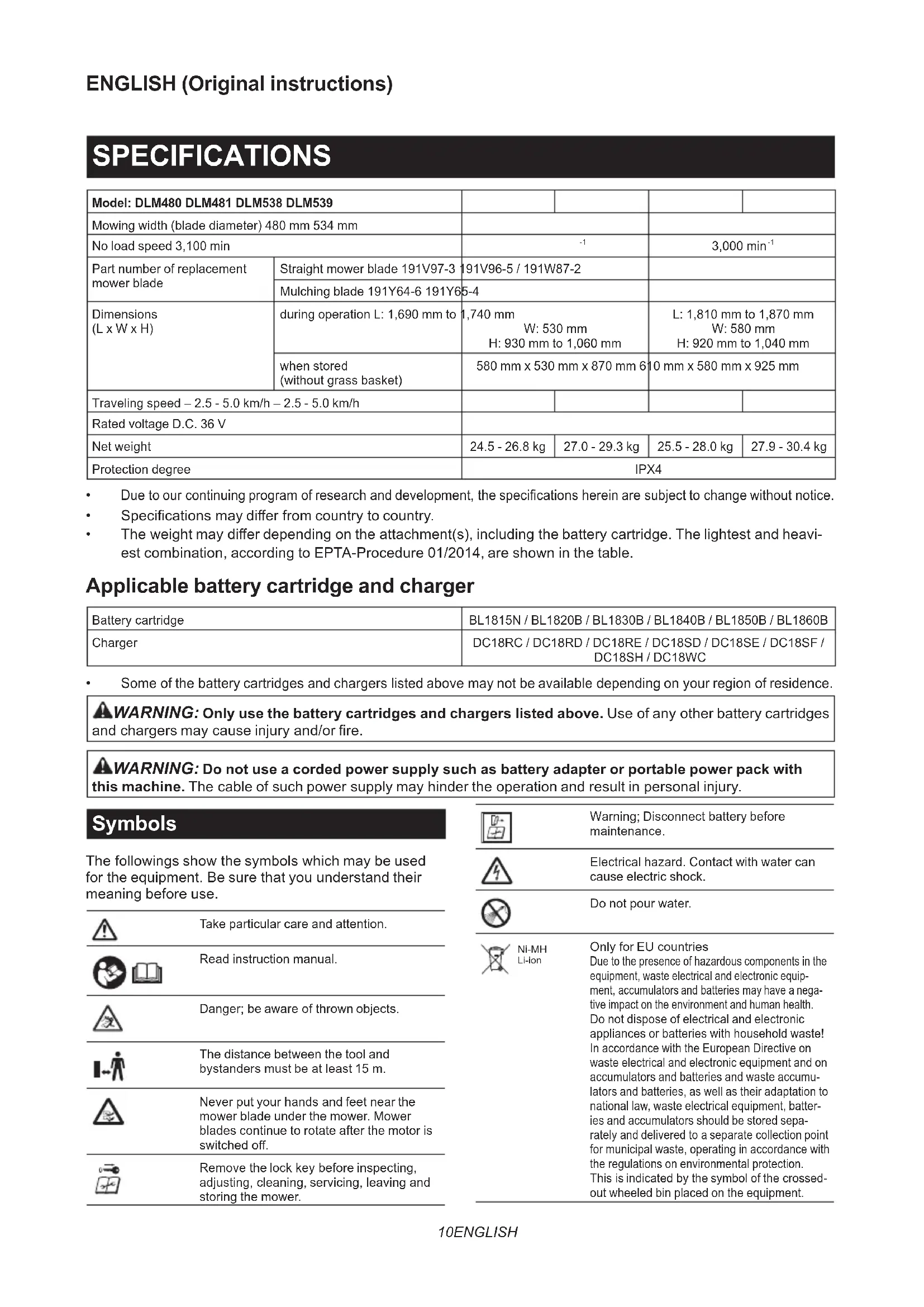 this machine. The cable of such power supply may hinder the operation and result in personal injury. Symbols The followings show the symbols which may be used for the equipment. Be sure that you understand their meaning before use. Take particular care and attention. Read instruction manual. Danger; be aware of thrown objects. The distance between the tool and bystanders must be at least 15 m. Never put your hands and feet near the mower blade under the mower. Mower blades continue to rotate after the motor is switched o. Remove the lock key before inspecting, adjusting, cleaning, servicing, leaving and storing the mower. Warning; Disconnect battery before maintenance. Electrical hazard. Contact with water can cause electric shock. Do not pour water. Ni-MH Li-ion Only for EU countries Due to the presence of hazardous components in the equipment, waste electrical and electronic equip- ment, accumulators and batteries may have a nega- tive impact on the environment and human health. Do not dispose of electrical and electronic appliances or batteries with household waste! In accordance with the European Directive on waste electrical and electronic equipment and on accumulators and batteries and waste accumu- lators and batteries, as well as their adaptation to national law, waste electrical equipment, batter- ies and accumulators should be stored sepa- rately and delivered to a separate collection point for municipal waste, operating in accordance with the regulations on environmental protection. This is indicated by the symbol of the crossed- out wheeled bin placed on the equipment.11 ENGLISH Guaranteed sound power level according to EU Outdoor Noise Directive.Sound power level according to Australia NSW Noise Control Regulation. Intended use The machine is intended for lawn mowing. Noise The typical A-weighted noise level determined accord- ing to EN60335-2-77: Model DLM480 Sound pressure level (L