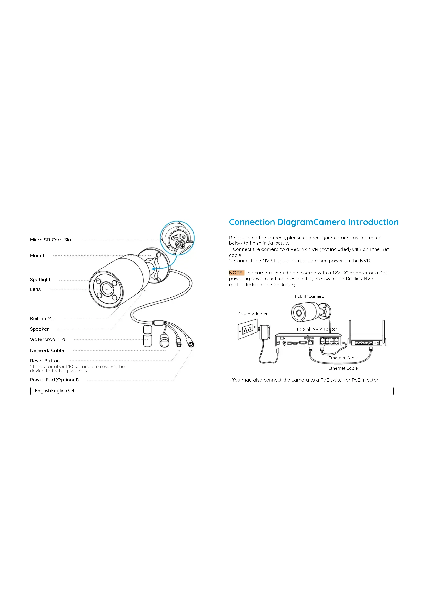 - You may also connect the camera to a PoE switch or PoE injector. NOTE: The camera should be powered with a 12V DC adapter or a PoE powering device such as PoE injector, PoE switch or Reolink NVR (not included in the package). PoE IP Camera Ethernet Cable Reolink NVR* Router Ethernet Cable Power Adapter Mount Micro SD Card Slot Spotlight Lens Built-in Mic Speaker Waterproof Lid Network Cable Reset Button Power Port(Optional)