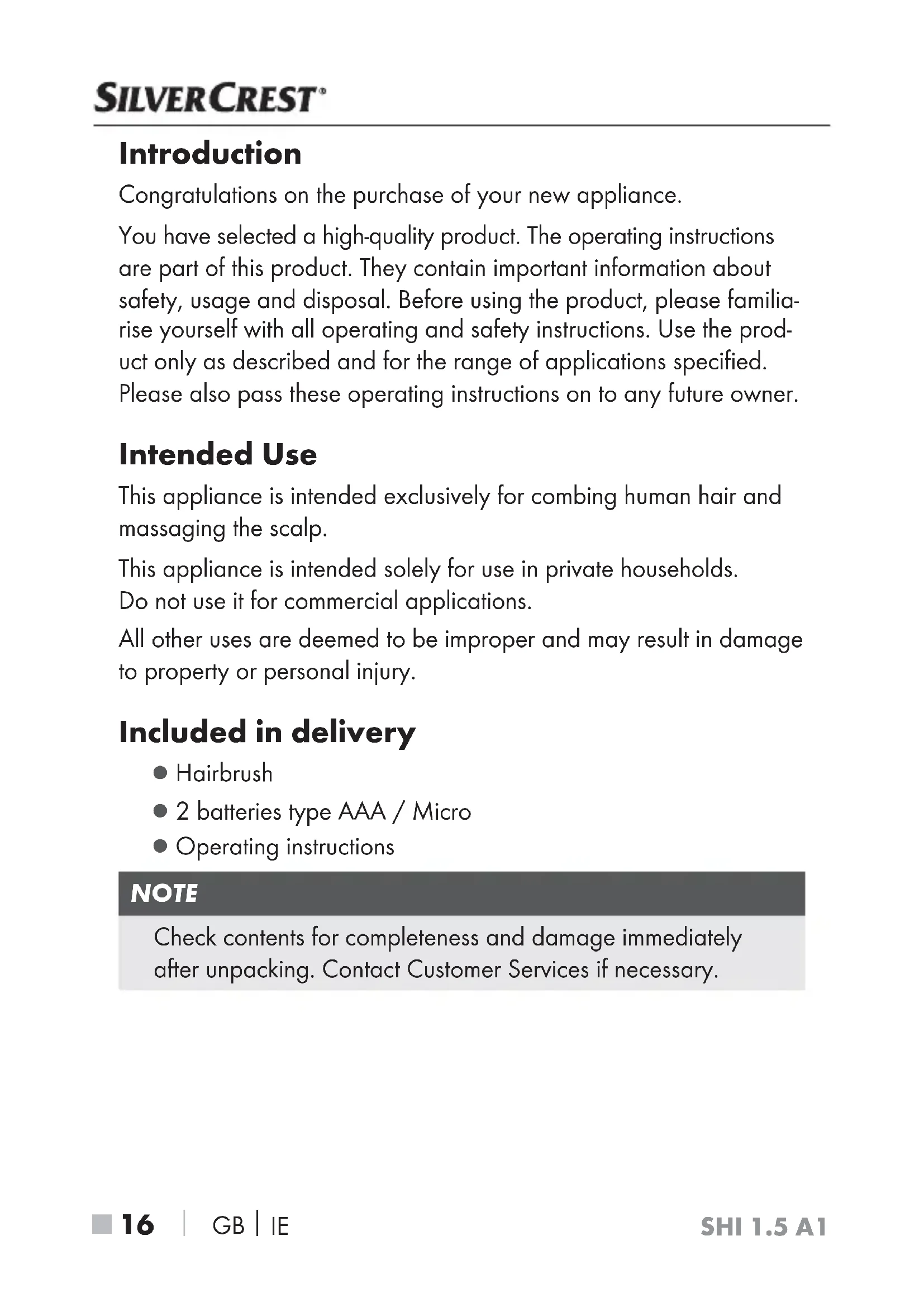 Introduction Congratulations on the purchase of your new appliance. You have selected a high-quality product. The operating instructions are part of this product. They contain important information about safety, usage and disposal. Before using the product, please familia- rise yourself with all operating and safety instructions. Use the prod- uct only as described and for the range of applications specified. Please also pass these operating instructions on to any future owner. Intended Use This appliance is intended exclusively for combing human hair and massaging the scalp. This appliance is intended solely for use in private households. Do not use it for commercial applications. All other uses are deemed to be improper and may result in damage to property or personal injury. Included in delivery ▯ Hairbrush ▯ 2 batteries type AAA / Micro ▯ Operating instructions NOTE Check contents for completeness and damage immediately after unpacking. Contact Customer Services if necessary.SHI 1.5 A1