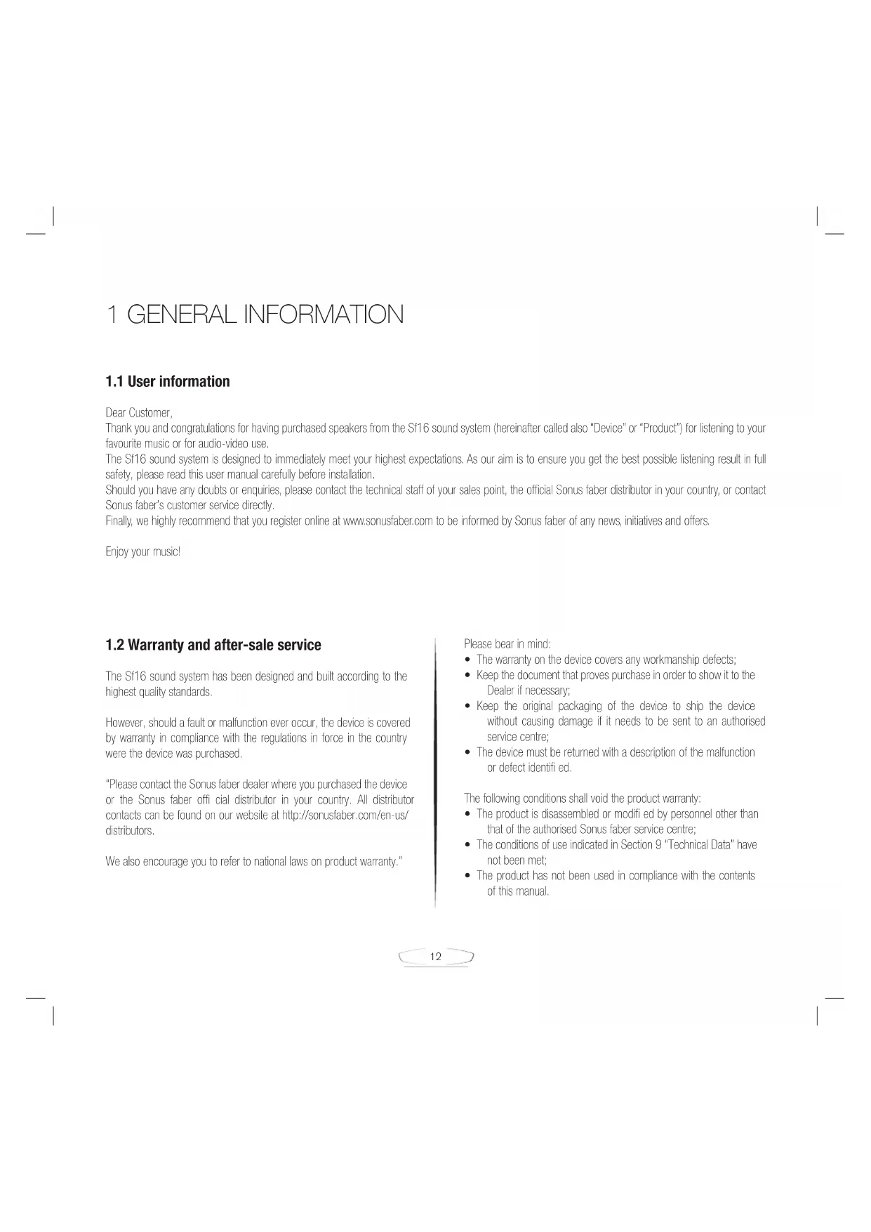 The Sf16 sound system has been designed and built according to the highest quality standards. However, should a fault or malfunction ever occur, the device is covered by warranty in compliance with the regulations in force in the country were the device was purchased. “Please contact the Sonus faber dealer where you purchased the device or the Sonus faber offi cial distributor in your country. All distributor contacts can be found on our website at http://sonusfaber.com/en-us/ distributors. We also encourage you to refer to national laws on product warranty.” Please bear in mind: