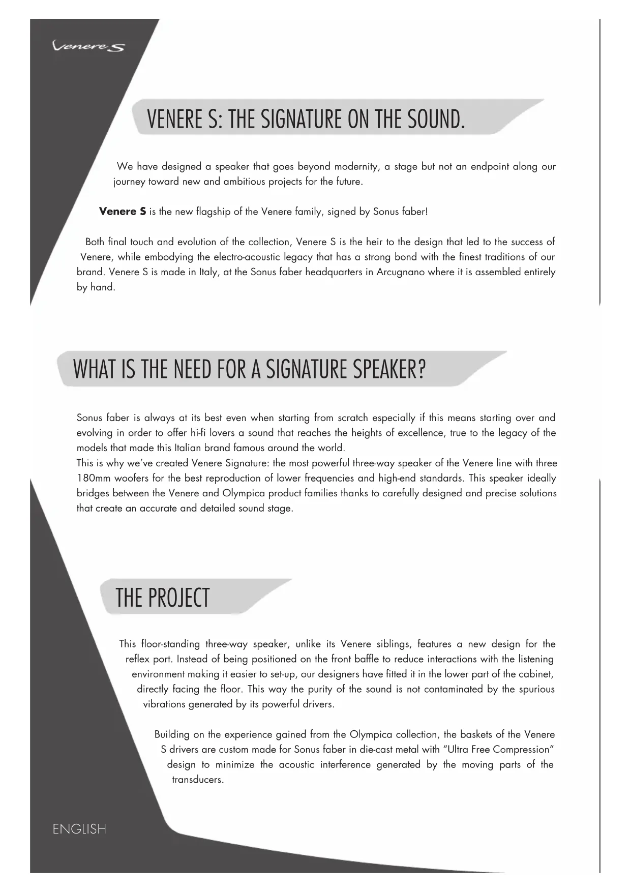 The design is faithful to that of the six models of the Venere collection, thus ensuring seamless integration into multi-channel systems. Venere S is clearly inspired by the shape of lyre that ensures no parallel inner surfaces and air movement volume control. The overall design of the cabinet is a the result of the needs of sound reproduction. Shape and function blend together to give life to elegant - yet functional - forms to achieve perfect acoustics, all while providing proper support to the drivers. Sleek and modern, the styling of Venere S stands out with a bolder approach compared to the collection, ideally completing it: the brushed aluminum around each driver gives a dash of character to the speaker’s front facade. The glass base found on the other Venere models is replaced by a brushed black aluminum plate with diamond edge to further energize the look of Venere S. All Venere S drivers are custom built according to the specific design of Sonus faber. The three woofers cones of Venere S are made of aluminum, providing for maximum lightness and stiffness of the transducers to achieve a fast response to transients at low frequencies. The midrange features a CurvTM membrane, a special thermoformed polypropylene fiber that provides the ideal solution for an absolutely natural reproduction of the main part of the audio spectrum. The high frequencies are reproduced by a tweeter with a soft dome membrane made of silk and manufactured by Dr. Kurt Mueller, the world’s best producer of moving parts. The tweeter is mechanically decoupled by interposing resilient material in order to make the transducer resistant to micro-vibrations generated by the intense activity of the other drivers. The result is an improvement of the precision and micro-dynamics that allows achieving an extremely focussed sound stage. The crossover network is assembled entirely in Italy with high-end components. Its semi-balanced configuration with a non-resonant “progressive slope” design and amplitude/phase response optimisation ensures the best time domain performance. In addition, the woofers feature “Trilobyte Ultrafast” filtering coils and the PCB tracks are made with nano- technologies that maximize the signal transmission speed.ENGLISH