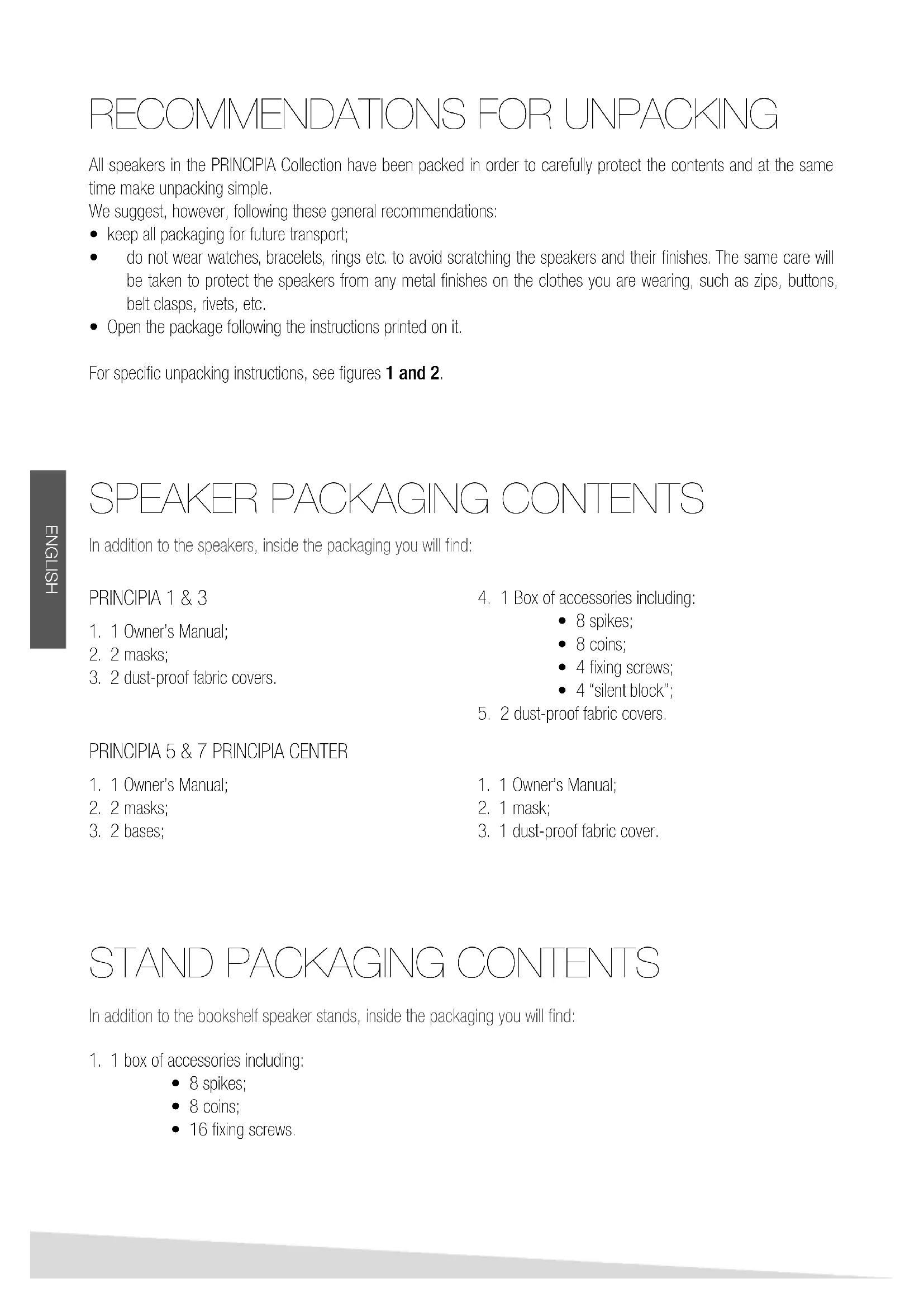 ENGLISHASSEMBLY Follow the indications below for the model you have. This operation must be carried out with all equipment switched off! The connecting clamps that accept connection with spade connectors, bananas and with the bare cable are on the rear panel of each speaker. There are 4 terminals on the PRINCIPIA 7, 5, 3 and 1 models which means that connection can be carried out in three ways: CONNECTION INSTRUCTIONS The terminals are to remain connected to each other through bridges; connect one speaker to the output terminals of the right channel of the amplifier, and the other speaker to the output terminals of the left channel of the amplifier, following the correct polarity as shown in fig. 5 and 6. Bi-amplification improves the reproduced sound in a general manner, and in particular gives greater dynamics and control of the bass frequencies. It requires two stereo amplifiers and two pairs of power cables and the connections between the speaker terminals must be removed. One amplifier is used to amplify the high frequencies (right and left channels), and is connected by a pair of power cables to the terminals dedicated to the high frequency drivers. The second amplifier is used to amplify the bass frequencies (right and left channels), and is connected by a pair of cables the terminals dedicated to the bass frequency drivers See fig. 9. The PRINCIPIA Center model features two connection terminals; the type and mode of connection is as shown in fig. 10. Finally, the accurate tightening of the contacts and a periodic check of these contributes to improved performance. The purpose of this type of connection is to enhance general reproduction quality, and in particular the bass frequencies. This requires two pairs of power cables used as follows: remove the connections between the terminals (bridges), connect each pair of terminals separately to the amplifier as shown in fig. 7 and 8. If you are using one of these bookshelf models with their specific stand, please read carefully the relevant assembly instructions and then the instructions for mounting the speaker on the stand (see fig. 3). When assembling the base and spikes at the base of these floor-standing models, please follow the instructions shown in fig. 4 carefully. The PRINCIPIA Center model is designed to be simply placed on a dedicated surface. MONO-WIRING BI-AMPLIFICATION BI-WIRING PRINCIPIA 1 & 3 PRINCIPIA 5 & 7 PRINCIPIA CENTER ENGLISHINSTALLATION RECOMMENDATIONS: