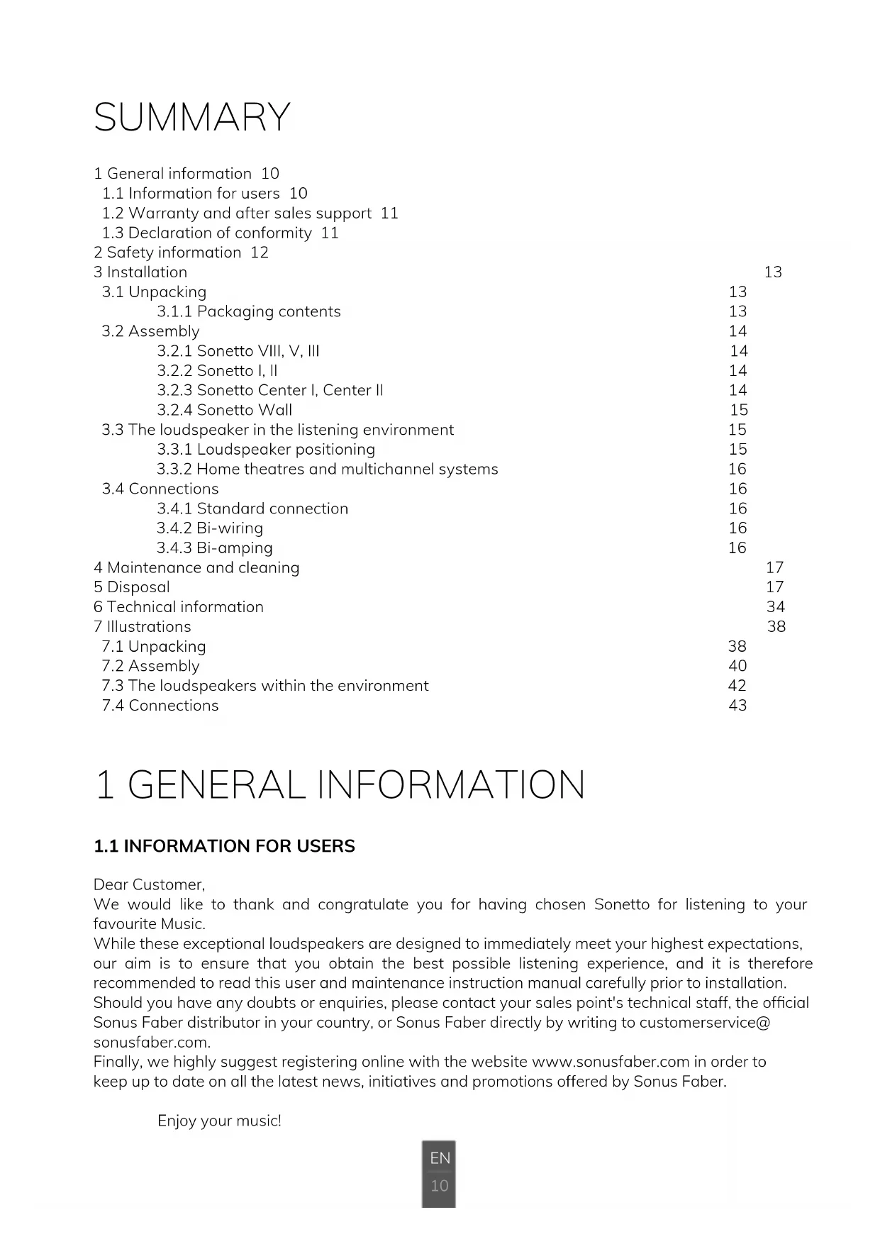 1 GENERAL INFORMATION SUMMARY Dear Customer, We would like to thank and congratulate you for having chosen Sonetto for listening to your favourite Music. While these exceptional loudspeakers are designed to immediately meet your highest expectations, our aim is to ensure that you obtain the best possible listening experience, and it is therefore recommended to read this user and maintenance instruction manual carefully prior to installation. Should you have any doubts or enquiries, please contact your sales point's technical staff, the ofcial Sonus Faber distributor in your country, or Sonus Faber directly by writing to customerservice@ sonusfaber.com. Finally, we highly suggest registering online with the website www.sonusfaber.com in order to keep up to date on all the latest news, initiatives and promotions offered by Sonus Faber. Enjoy your music! 1 General information 10