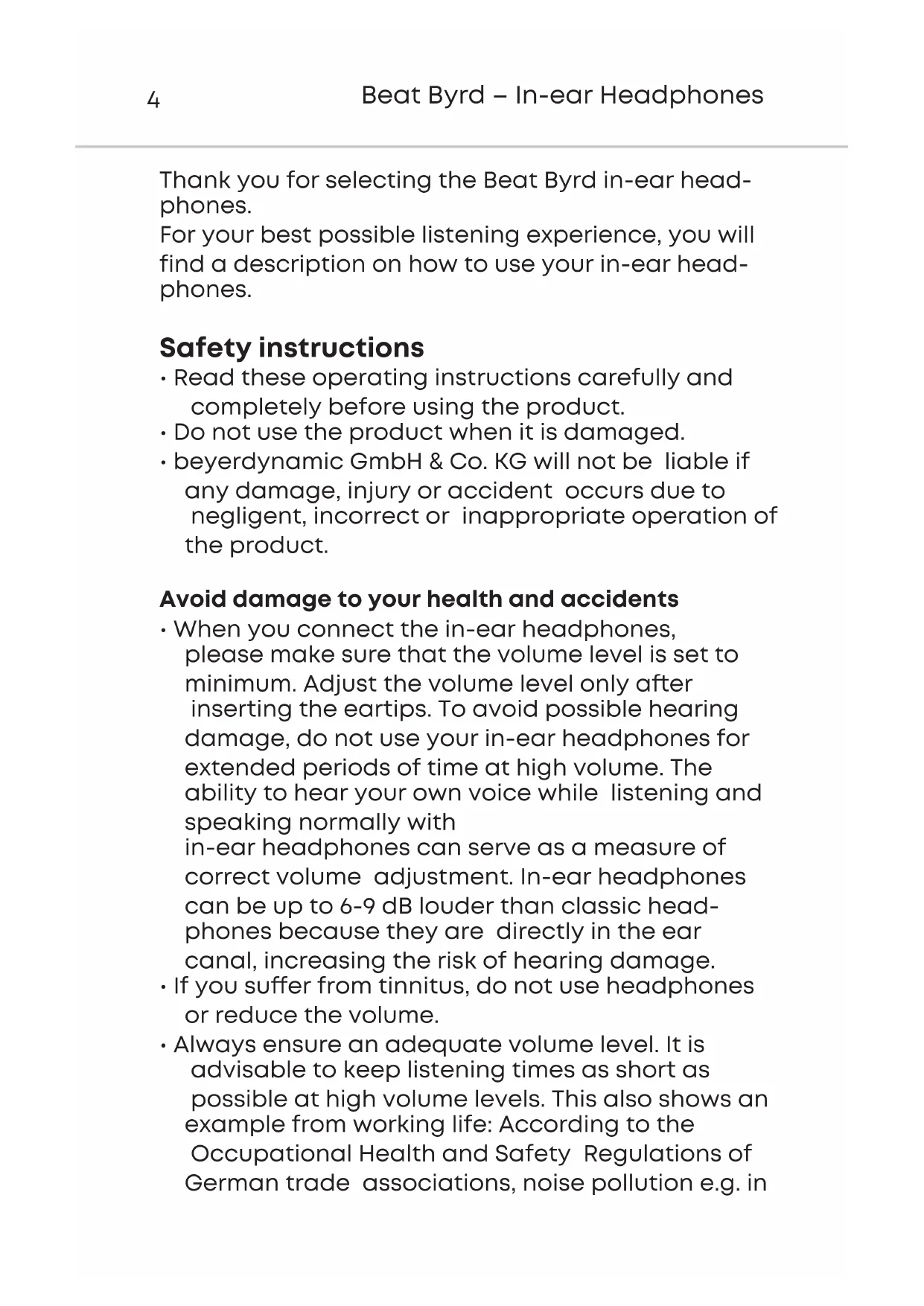 - Always ensure an adequate volume level. It is advisable to keep liening times as sho as possible at high volume levels. This also shows an example from working life: According to the Occupational Health and Safety Regulations of German trade associations, noise pollution e.g. inenglish Beat Byrd – In-ear Headphones