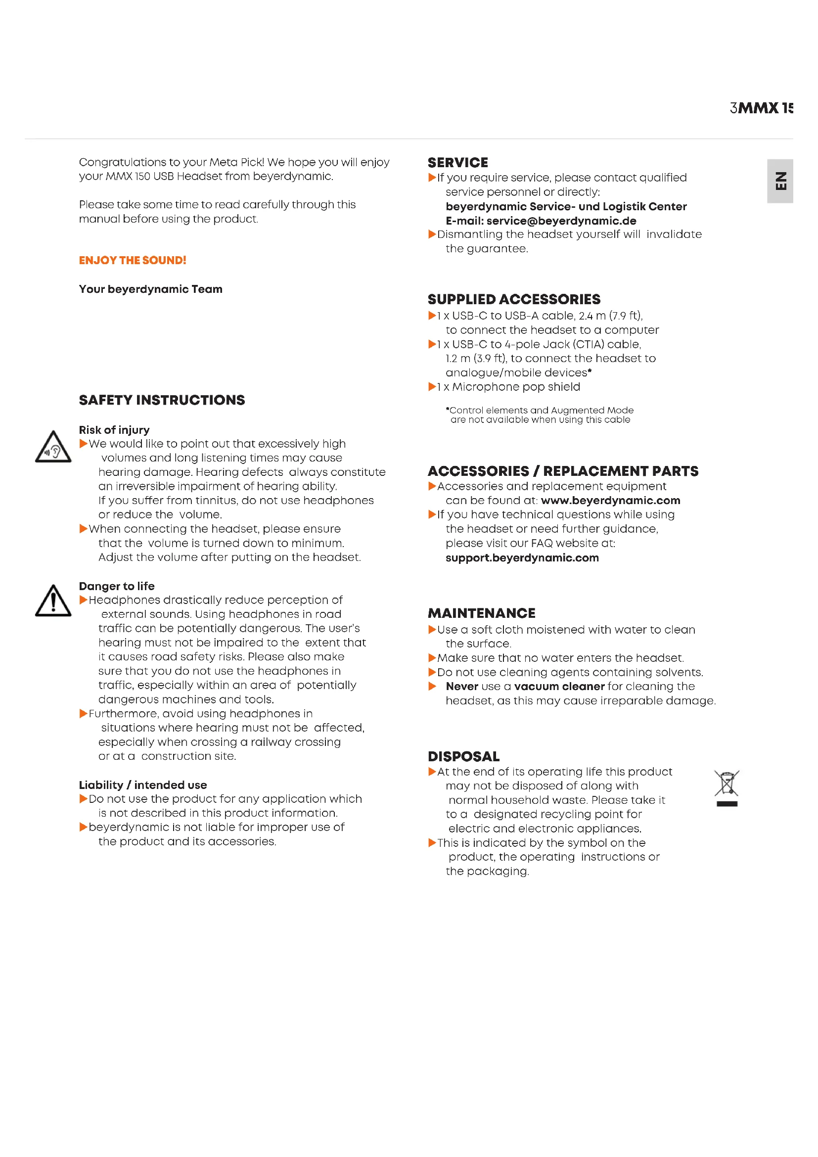 Congratulations to your Meta Pick! We hope you will enjoy your MMX 150 USB Headset from beyerdynamic. Please take some time to read carefully through this manual before using the product.