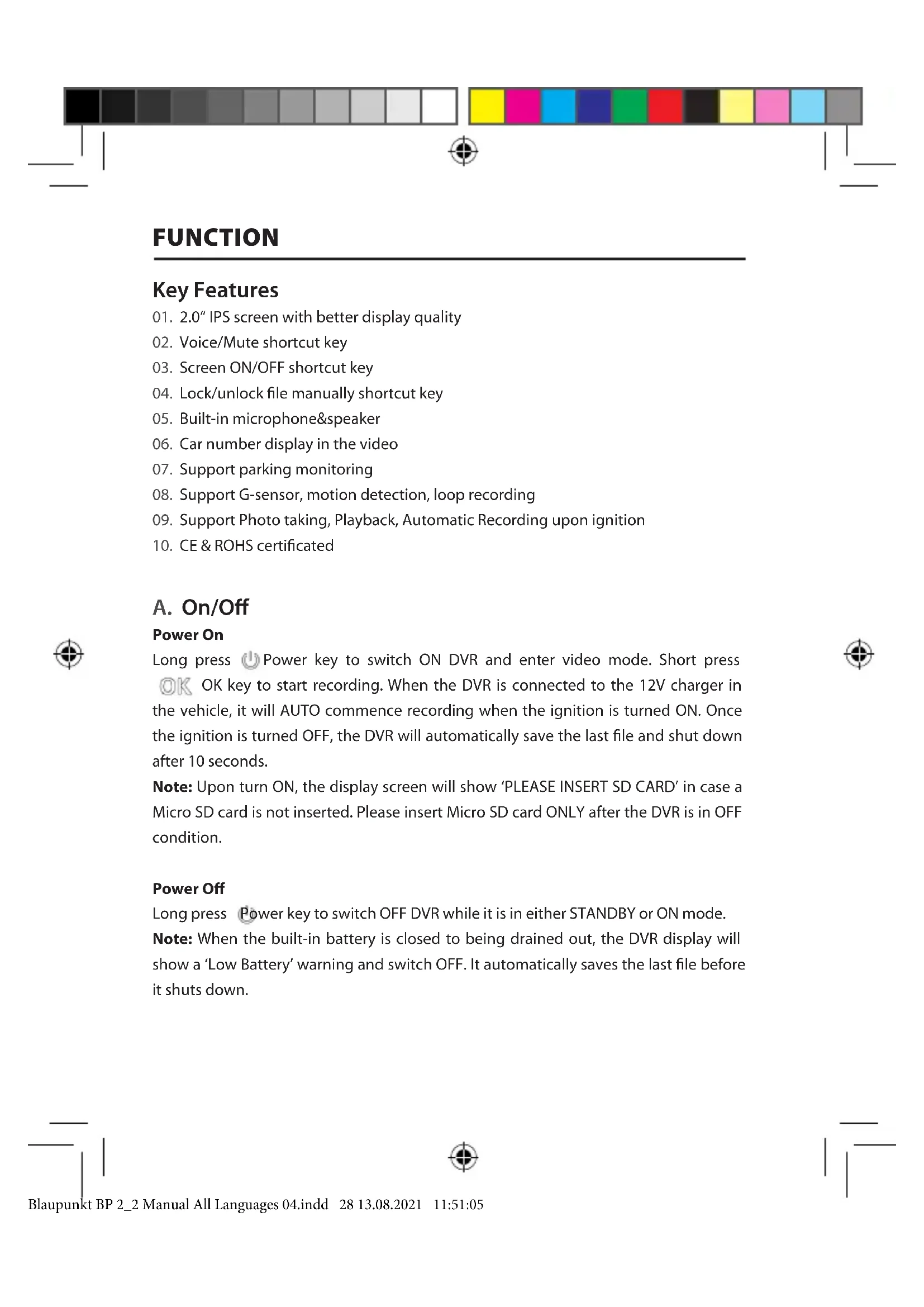 Blaupunkt BP 2_2 Manual All Languages 04.indd 27 13.08.2021 11:51:05A. On/O Power On Long press Power key to switch ON DVR and enter video mode. Short press OK key to start recording. When the DVR is connected to the 12V charger in the vehicle, it will AUTO commence recording when the ignition is turned ON. Once the ignition is turned OFF, the DVR will automatically save the last le and shut down after 10 seconds. Note: Upon turn ON, the display screen will show ‘PLEASE INSERT SD CARD’ in case a Micro SD card is not inserted. Please insert Micro SD card ONLY after the DVR is in OFF condition. Power O Long press Power key to switch OFF DVR while it is in either STANDBY or ON mode. Note: When the built-in battery is closed to being drained out, the DVR display will show a ‘Low Battery’ warning and switch OFF. It automatically saves the last le before it shuts down. Key Features