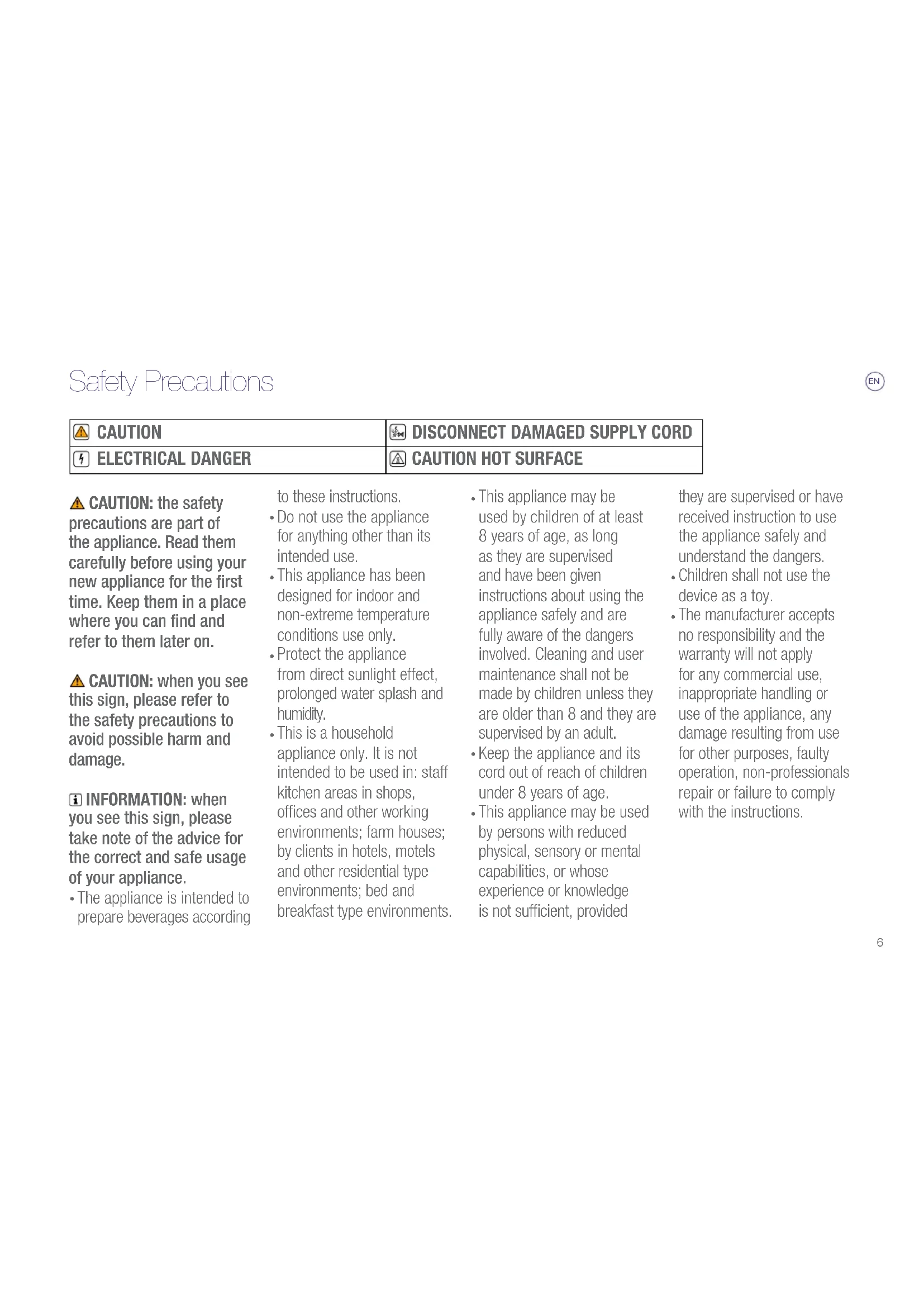 The manufacturer accepts no responsibility and the warranty will not apply for any commercial use, inappropriate handling or use of the appliance, any damage resulting from use for other purposes, faulty operation, non-professionals repair or failure to comply with the instructions. Safety Precautions CAUTION ELECTRICAL DANGER7