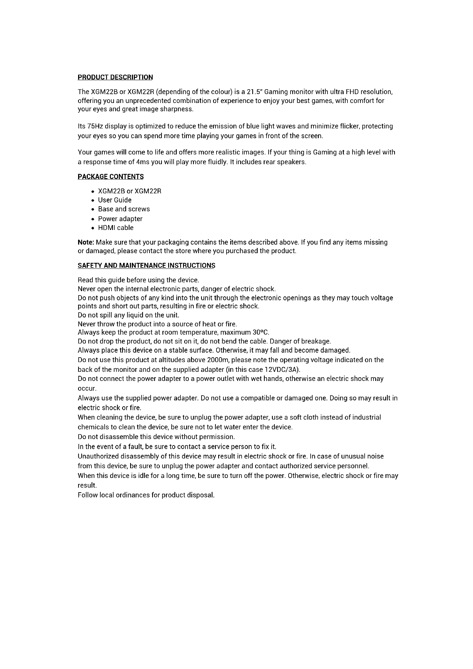 Read this guide before using the device. Never open the internal electronic parts, danger of electric shock. Do not push objects of any kind into the unit through the electronic openings as they may touch voltage points and short out parts, resulting in fire or electric shock. Do not spill any liquid on the unit. Never throw the product into a source of heat or fire. Always keep the product at room temperature, maximum 30ºC. Do not drop the product, do not sit on it, do not bend the cable. Danger of breakage. Always place this device on a stable surface. Otherwise, it may fall and become damaged. Do not use this product at altitudes above 2000m, please note the operating voltage indicated on the back of the monitor and on the supplied adapter (in this case 12VDC/3A). Do not connect the power adapter to a power outlet with wet hands, otherwise an electric shock may occur. Always use the supplied power adapter. Do not use a compatible or damaged one. Doing so may result in electric shock or fire. When cleaning the device, be sure to unplug the power adapter, use a soft cloth instead of industrial chemicals to clean the device, be sure not to let water enter the device. Do not disassemble this device without permission. In the event of a fault, be sure to contact a service person to fix it. Unauthorized disassembly of this device may result in electric shock or fire. In case of unusual noise from this device, be sure to unplug the power adapter and contact authorized service personnel. When this device is idle for a long time, be sure to turn off the power. Otherwise, electric shock or fire may result. Follow local ordinances for product disposal.INPUTS AND OUTPUTS HDMI input If your PC has HDMI video output, connect the supplied HDMI cable between the HDMI input of the monitor and the HDMI output of the PC. This input is HDMI version 1.4. VGA input If your PC has VGA video output, purchase a VGA cable and connect it between the VGA input of the monitor and the VGA output of the PC. DC input Connect the supplied power supply cable to the DC input of the Monitor and plug the adapter into a household electrical outlet. 12V/3A power supply. 3.5mm jack input This input can only be used if the monitor is connected via a VGA cable, purchase a 3.5mm Jack to 3.5mm Jack (male-male) cable and connect it between the audio output of your PC and the 3.5mm Jack input of the monitor, the PC audio will be played through the rear speakers of the monitor.