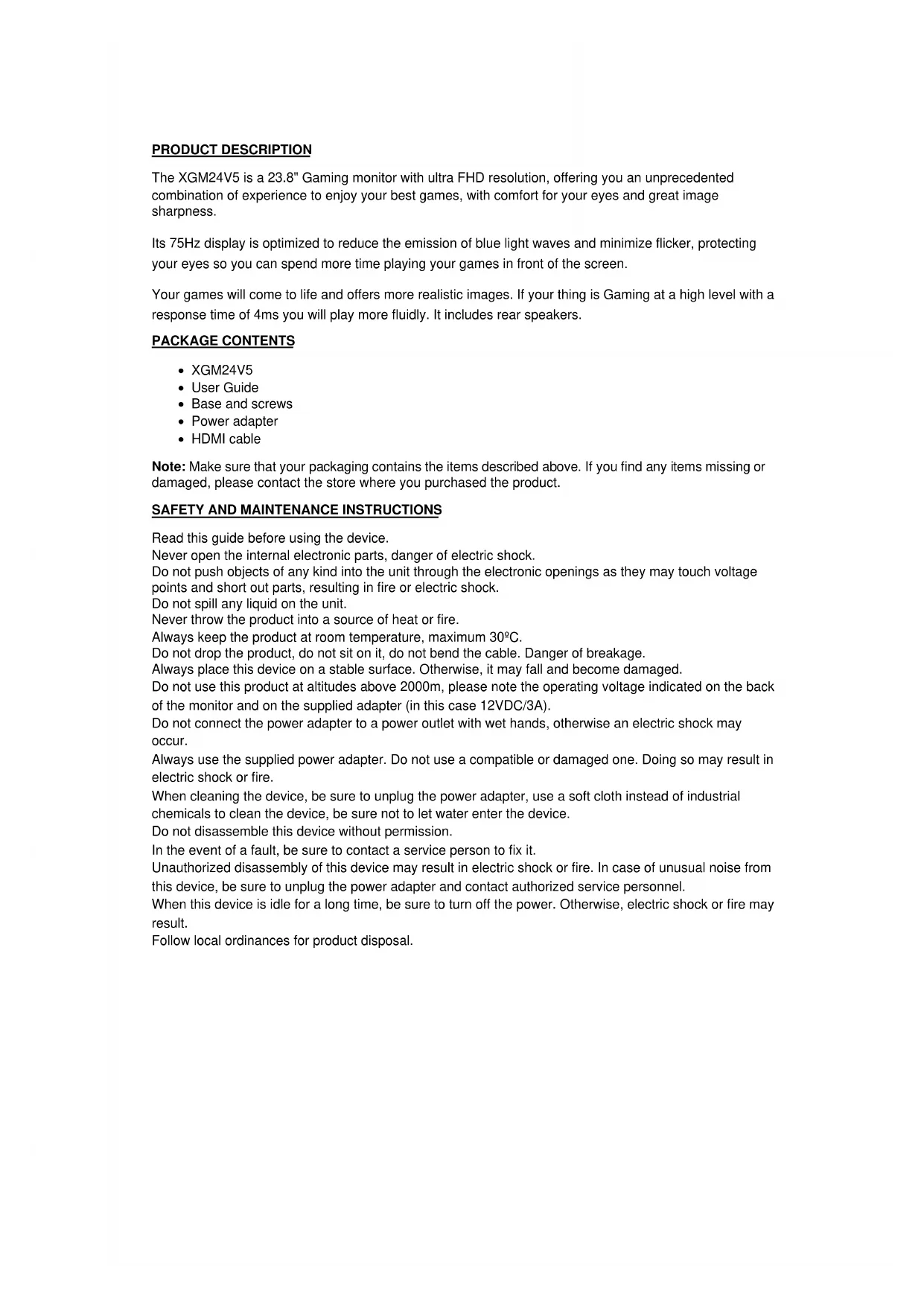 Read this guide before using the device. Never open the internal electronic parts, danger of electric shock. Do not push objects of any kind into the unit through the electronic openings as they may touch voltage points and short out parts, resulting in fire or electric shock. Do not spill any liquid on the unit. Never throw the product into a source of heat or fire. Always keep the product at room temperature, maximum 30ºC. Do not drop the product, do not sit on it, do not bend the cable. Danger of breakage. Always place this device on a stable surface. Otherwise, it may fall and become damaged. Do not use this product at altitudes above 2000m, please note the operating voltage indicated on the back of the monitor and on the supplied adapter (in this case 12VDC/3A). Do not connect the power adapter to a power outlet with wet hands, otherwise an electric shock may occur. Always use the supplied power adapter. Do not use a compatible or damaged one. Doing so may result in electric shock or fire. When cleaning the device, be sure to unplug the power adapter, use a soft cloth instead of industrial chemicals to clean the device, be sure not to let water enter the device. Do not disassemble this device without permission. In the event of a fault, be sure to contact a service person to fix it. Unauthorized disassembly of this device may result in electric shock or fire. In case of unusual noise from this device, be sure to unplug the power adapter and contact authorized service personnel. When this device is idle for a long time, be sure to turn off the power. Otherwise, electric shock or fire may result. Follow local ordinances for product disposal.INPUTS AND OUTPUTS HDMI input If your PC has HDMI video output, connect the supplied HDMI cable between the HDMI input of the monitor and the HDMI output of the PC. This input is HDMI version 1.4. VGA input If your PC has VGA video output, purchase a VGA cable and connect it between the VGA input of the monitor and the VGA output of the PC. DC input Connect the supplied power supply cable to the DC input of the Monitor and plug the adapter into a household electrical outlet. 12V/3A power supply. 3.5mm jack input This input can only be used if the monitor is connected via a VGA cable, purchase a 3.5mm Jack to 3.5mm Jack (male-male) cable and connect it between the audio output of your PC and the 3.5mm Jack input of the monitor, the PC audio will be played through the rear speakers of the monitor. JOYSTICK FUNCTIONS Press the Joystick to turn the monitor on or off. Note: To access the monitor options you must have a source connected to one of its inputs. Move the Joystick up to move up between the different menus and modify the values. If you are not in the OSD menu, it allows you to change the screen format (16: 9 or 4: 3) Move the Joystick down to move down between the different menus and modify the values. If you are not in the OSD menu, it allows you to change the different types of screen displays. Move the Joystick to the right to display the OSD menu on the screen. Once inside, it also has the function of accepting or accessing the internal functions. Move the Joystick to the left to exit the current menu or exit the OSD menu.OSD MENU The OSD menu of the monitor provides various settings for the monitor, such as colour, brightness and contrast, etc. IMAGE BRIGHTNESS Allows you to adjust brightness levels CONTRAST Adjusts contrast levels ECO MODE Allows you to select different presets. DCR Enables or Disables the DCR setting. COLOR COLOR TEMPERATURE Allows you to set different colour options: User, Cool, Normal, Warm, Normal, Warm. RED Make adjustments with red colours prevailing GREEN Make adjustments with green colours prevailing BLUE Make adjustments prevailing the blue colours