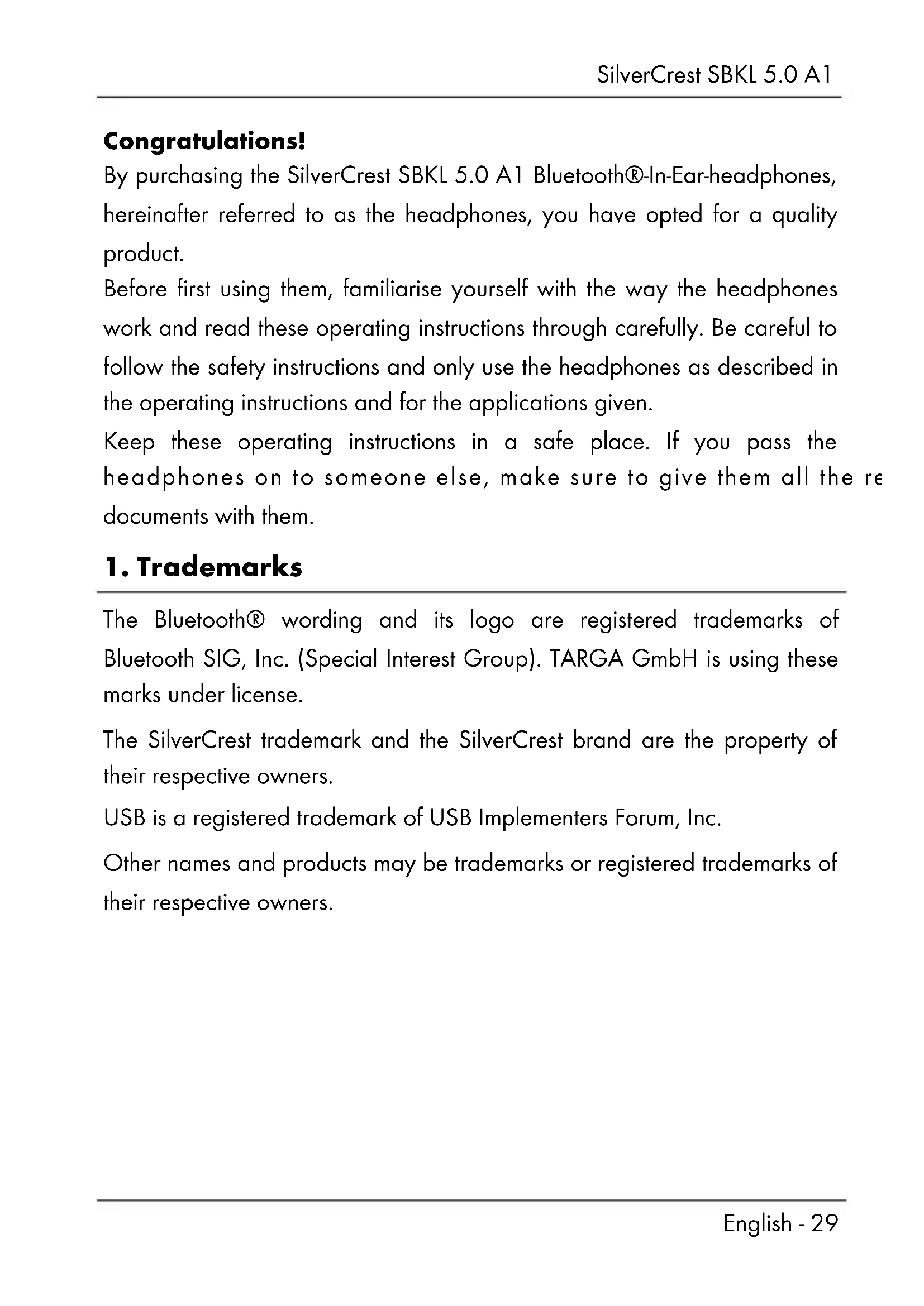 English - 29 Congratulations! By purchasing the SilverCrest SBKL 5.0 A1 Bluetooth®-In-Ear-headphones, hereinafter referred to as the headphones, you have opted for a quality product. Before first using them, familiarise yourself with the way the headphones work and read these operating instructions through carefully. Be careful to follow the safety instructions and only use the headphones as described in the operating instructions and for the applications given. Keep these operating instructions in a safe place. If you pass the headphones on to someone else, make sure to give them all the relevant documents with them.