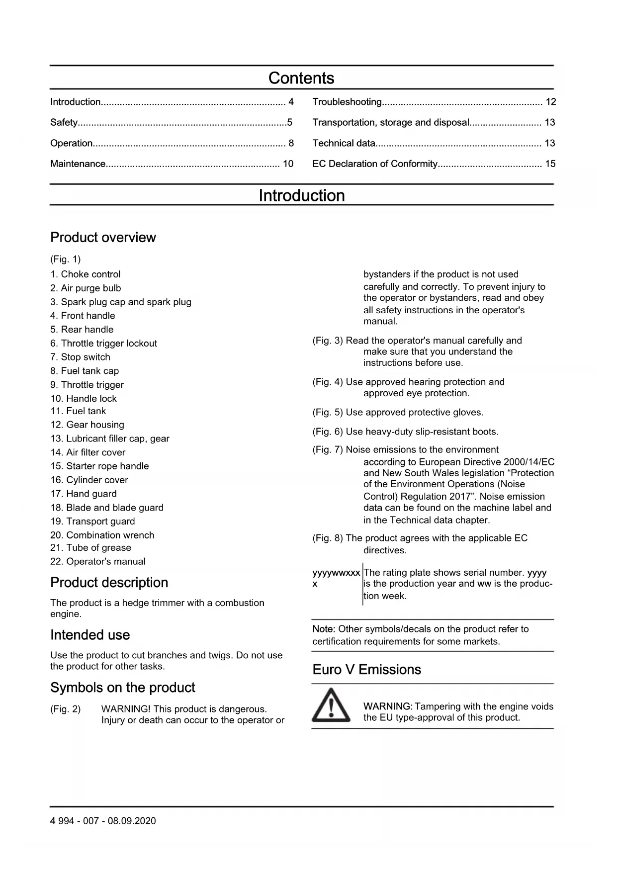 Product description The product is a hedge trimmer with a combustion engine. Intended use Use the product to cut branches and twigs. Do not use the product for other tasks. Symbols on the product (Fig. 2) WARNING! This product is dangerous. Injury or death can occur to the operator or bystanders if the product is not used carefully and correctly. To prevent injury to the operator or bystanders, read and obey all safety instructions in the operator's manual. (Fig. 3) Read the operator's manual carefully and make sure that you understand the instructions before use. (Fig. 4) Use approved hearing protection and approved eye protection. (Fig. 5) Use approved protective gloves. (Fig. 6) Use heavy-duty slip-resistant boots. (Fig. 7) Noise emissions to the environment according to European Directive 2000/14/EC and New South Wales legislation “Protection of the Environment Operations (Noise Control) Regulation 2017”. Noise emission data can be found on the machine label and in the Technical data chapter. (Fig. 8) The product agrees with the applicable EC directives. yyyywwxxx