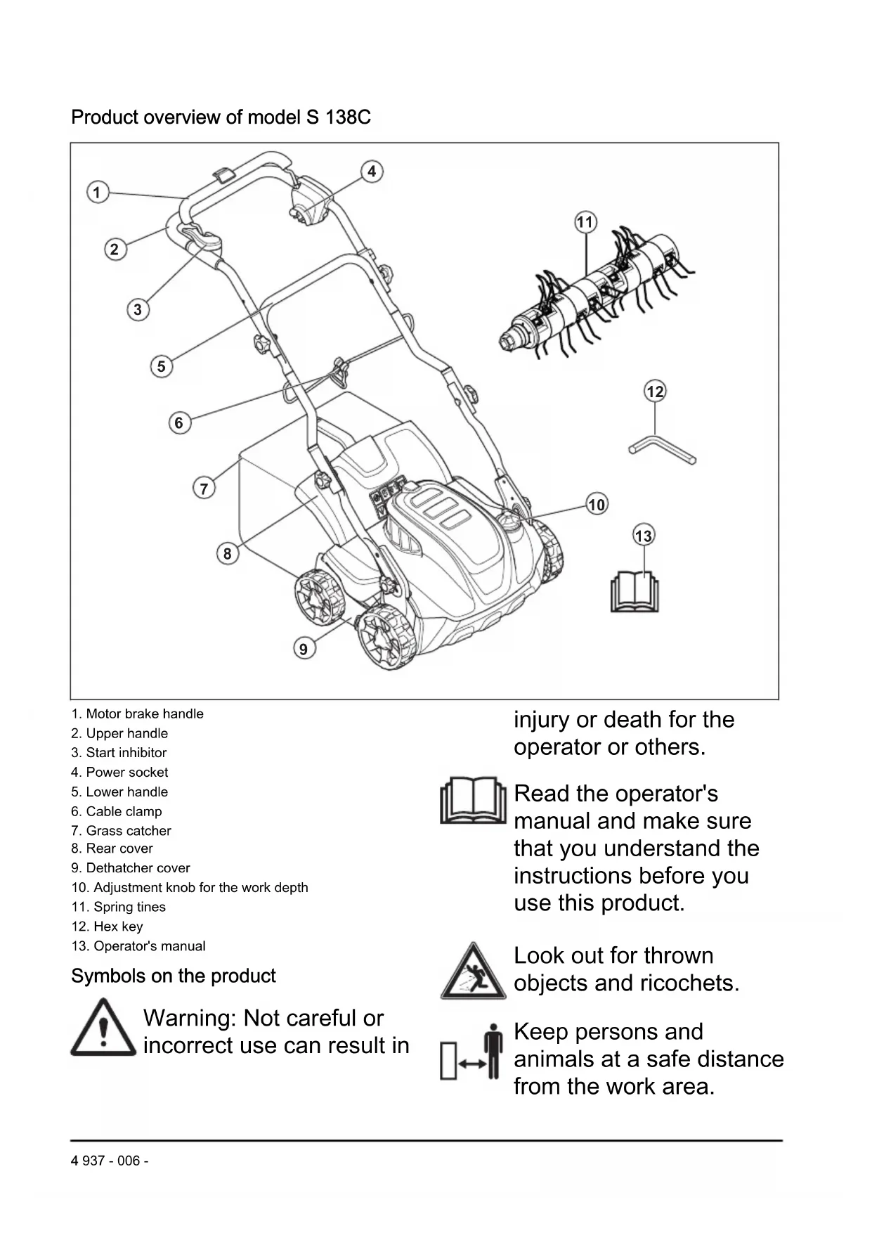 incorrect use can result in injury or death for the operator or others. Read the operator's manual and make sure that you understand the instructions before you use this product. Look out for thrown objects and ricochets. Keep persons and animals at a safe distance from the work area. 4 937 - 006 -Warning: Keep hands and feet away from the rotating blade. Remove the safety key before you do maintenance on the product (model S 138i). Disconnect the product from electrical outlet before you do maintenance on the product (model S 138C). Electrical shock hazard (model S 138C). Do not expose to rain (model S 138i).