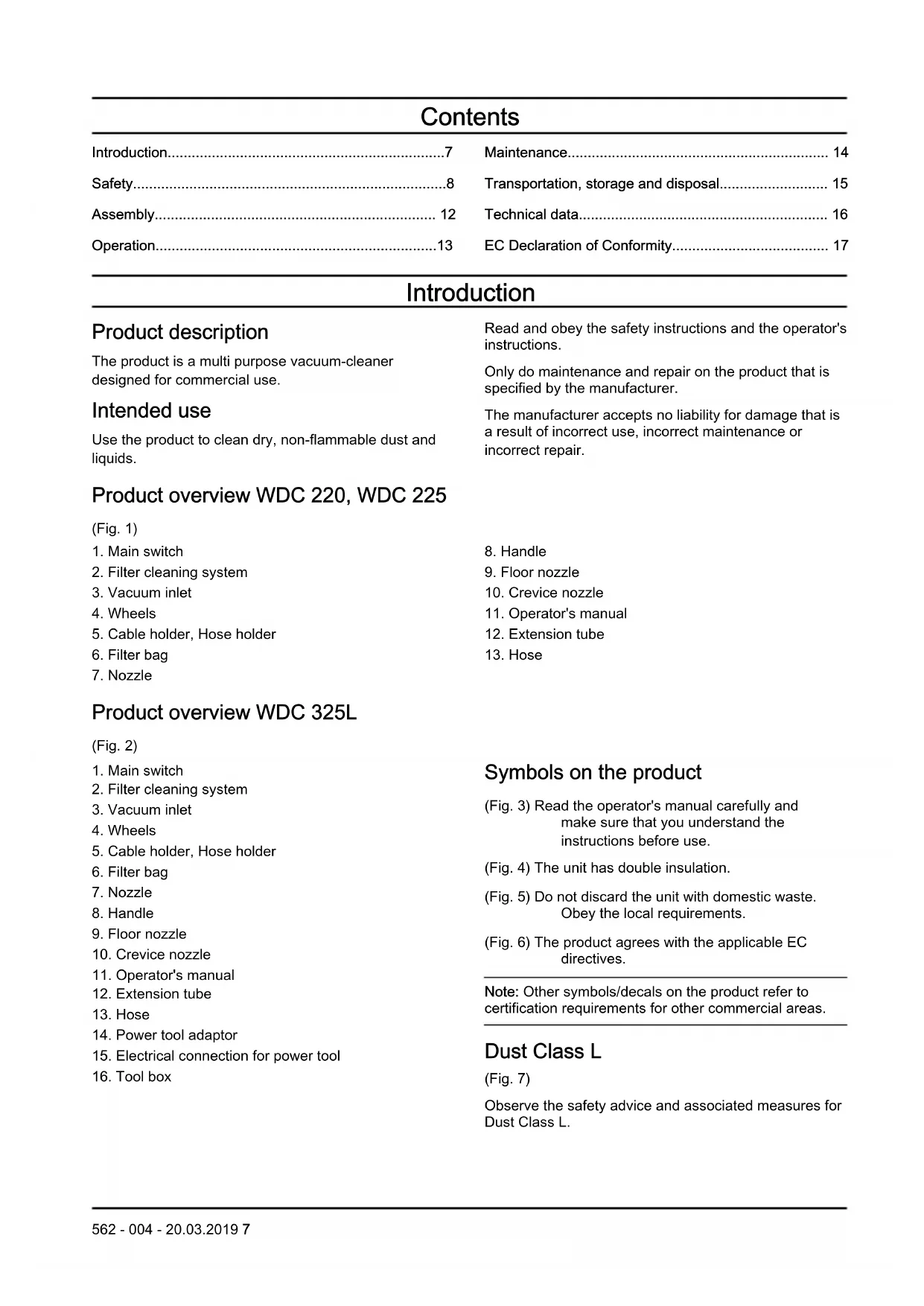 Symbols on the product (Fig. 3) Read the operator's manual carefully and make sure that you understand the instructions before use. (Fig. 4) The unit has double insulation. (Fig. 5) Do not discard the unit with domestic waste. Obey the local requirements. (Fig. 6) The product agrees with the applicable EC directives. Note: Other symbols/decals on the product refer to certification requirements for other commercial areas. Dust Class L (Fig. 7) Observe the safety advice and associated measures for Dust Class L.