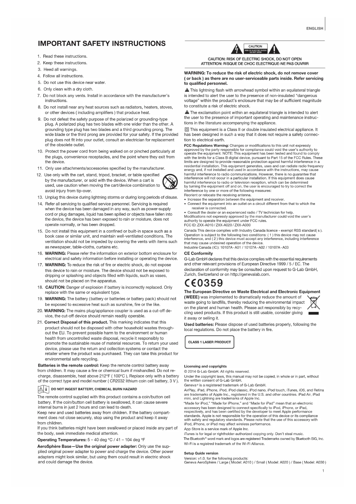 word mark and logos are registered Trademarks owned by Bluetooth SIG, Inc. Wi-Fi is a registred trademark of the Wi-Fi Alliance. Setup Guide version Version: v1.0. for the following products: Geneva AeroSphère / Large ( Model: A010 ) / Small ( Model: A020 ) / Base ( Model: A030 )2 I ABOUT THE GENEVA AEROSPHÈRE SYSTEM