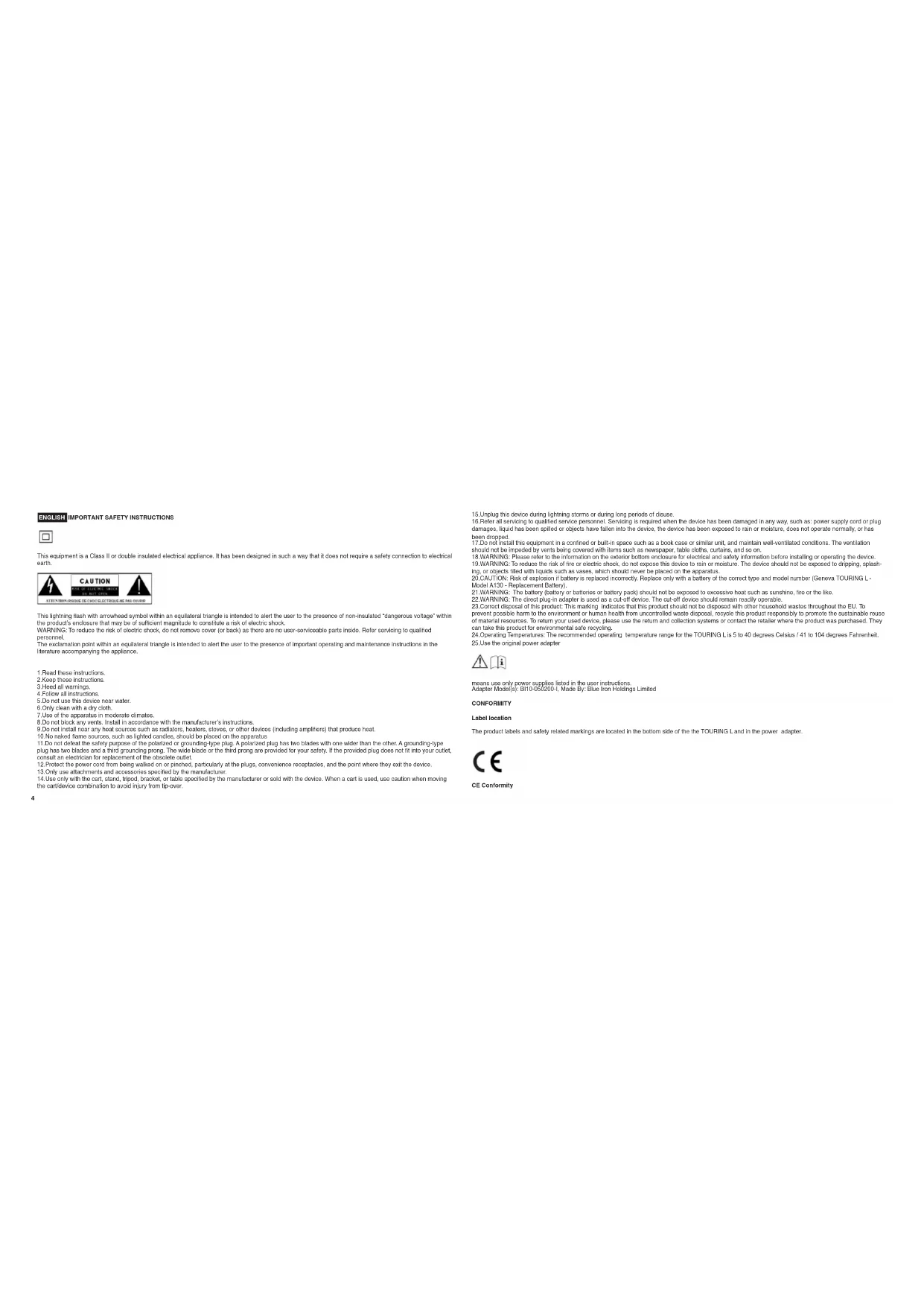means use only power supplies listed in the user instructions. Adapter Model(s): BI10-050200-I, Made By: Blue Iron Holdings Limited CONFORMITY Label location The product labels and safety related markings are located in the bottom side of the the TOURING L and in the power adapter.
