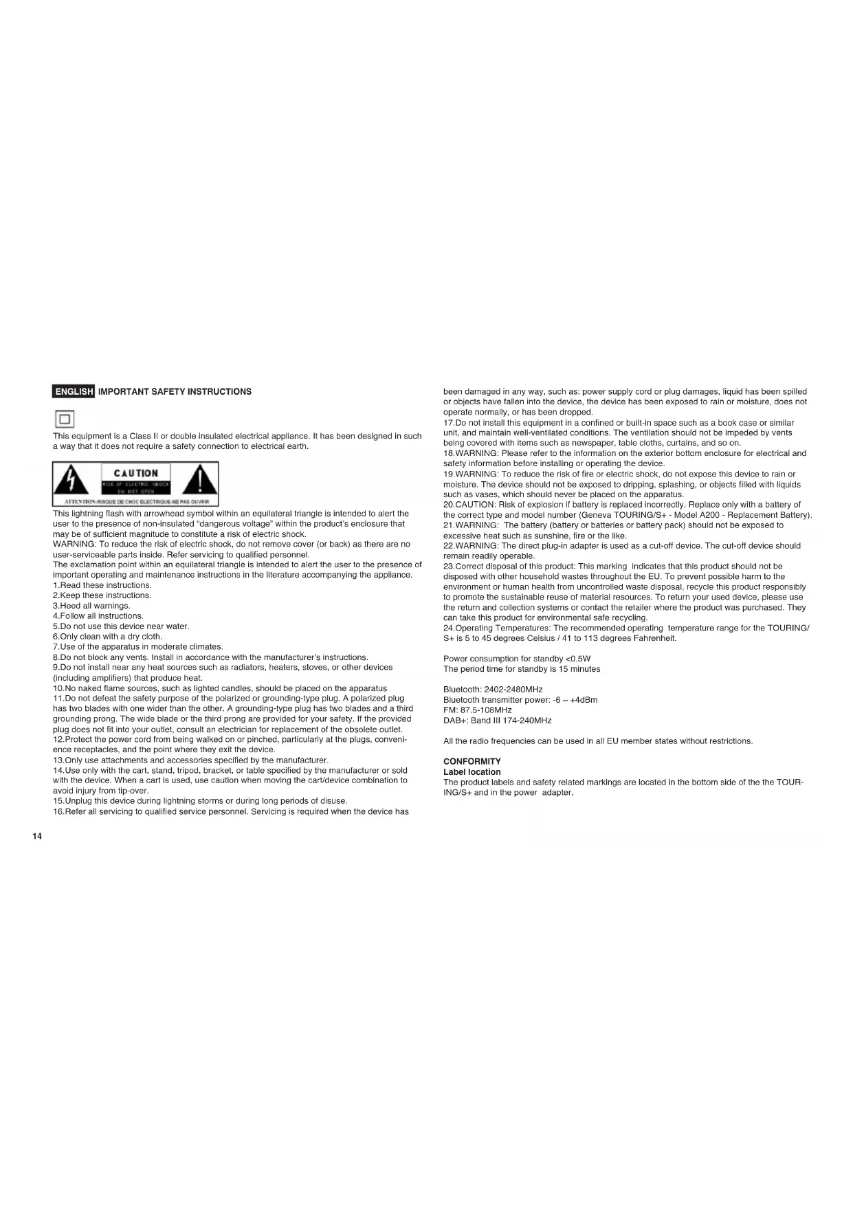 user-serviceable parts inside. Refer servicing to qualied personnel. The exclamation point within an equilateral triangle is intended to alert the user to the presence of important operating and maintenance instructions in the literature accompanying the appliance. 1.Read these instructions. 2.Keep these instructions. 3.Heed all warnings. 4.Follow all instructions. 5.Do not use this device near water. 6.Only clean with a dry cloth. 7.Use of the apparatus in moderate climates. 8.Do not block any vents. Install in accordance with the manufacturer’s instructions. 9.Do not install near any heat sources such as radiators, heaters, stoves, or other devices (including ampliers) that produce heat. 10.No naked ame sources, such as lighted candles, should be placed on the apparatus 11.Do not defeat the safety purpose of the polarized or grounding-type plug. A polarized plug has two blades with one wider than the other. A grounding-type plug has two blades and a third grounding prong. The wide blade or the third prong are provided for your safety. If the provided plug does not t into your outlet, consult an electrician for replacement of the obsolete outlet. 12.Protect the power cord from being walked on or pinched, particularly at the plugs, conveni- ence receptacles, and the point where they exit the device. 13.Only use attachments and accessories specied by the manufacturer. 14.Use only with the cart, stand, tripod, bracket, or table specied by the manufacturer or sold with the device. When a cart is used, use caution when moving the cart/device combination to avoid injury from tip-over. 15.Unplug this device during lightning storms or during long periods of disuse. 16.Refer all servicing to qualied service personnel. Servicing is required when the device has been damaged in any way, such as: power supply cord or plug damages, liquid has been spilled or objects have fallen into the device, the device has been exposed to rain or moisture, does not operate normally, or has been dropped. 17.Do not install this equipment in a conned or built-in space such as a book case or similar unit, and maintain well-ventilated conditions. The ventilation should not be impeded by vents being covered with items such as newspaper, table cloths, curtains, and so on. 18.WARNING: Please refer to the information on the exterior bottom enclosure for electrical and safety information before installing or operating the device. 19.WARNING: To reduce the risk of re or electric shock, do not expose this device to rain or moisture. The device should not be exposed to dripping, splashing, or objects lled with liquids such as vases, which should never be placed on the apparatus. 20.CAUTION: Risk of explosion if battery is replaced incorrectly. Replace only with a battery of the correct type and model number (Geneva TOURING/S+ - Model A200 - Replacement Battery). 21.WARNING: The battery (battery or batteries or battery pack) should not be exposed to excessive heat such as sunshine, re or the like. 22.WARNING: The direct plug-in adapter is used as a cut-off device. The cut-off device should remain readily operable. 23.Correct disposal of this product: This marking indicates that this product should not be disposed with other household wastes throughout the EU. To prevent possible harm to the environment or human health from uncontrolled waste disposal, recycle this product responsibly to promote the sustainable reuse of material resources. To return your used device, please use the return and collection systems or contact the retailer where the product was purchased. They can take this product for environmental safe recycling. 24.Operating Temperatures: The recommended operating temperature range for the TOURING/ S+ is 5 to 45 degrees Celsius / 41 to 113 degrees Fahrenheit. Power consumption for standby <0.5W The period time for standby is 15 minutes Bluetooth: 2402-2480MHz Bluetooth transmitter power: -6 ~ +4dBm FM: 87.5-108MHz DAB+: Band III 174-240MHz All the radio frequencies can be used in all EU member states without restrictions. CONFORMITY Label location The product labels and safety related markings are located in the bottom side of the the TOUR- ING/S+ and in the power adapter.15