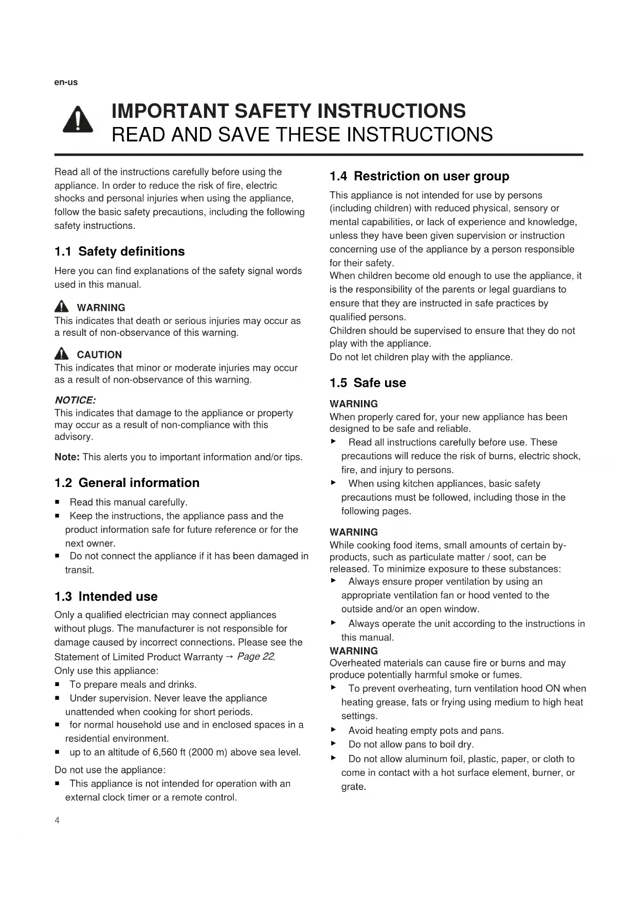 Only use this appliance: ¡ To prepare meals and drinks. ¡ Under supervision. Never leave the appliance unattended when cooking for short periods. ¡ for normal household use and in enclosed spaces in a residential environment. ¡ up to an altitude of 6,560ft (2000m) above sea level. Do not use the appliance: ¡ This appliance is not intended for operation with an external clock timer or a remote control. 1.4 Restriction on user group This appliance is not intended for use by persons (including children) with reduced physical, sensory or mental capabilities, or lack of experience and knowledge, unless they have been given supervision or instruction concerning use of the appliance by a person responsible for their safety. When children become old enough to use the appliance, it is the responsibility of the parents or legal guardians to ensure that they are instructed in safe practices by qualified persons. Children should be supervised to ensure that they do not play with the appliance. Do not let children play with the appliance. 1.5 Safe use WARNING When properly cared for, your new appliance has been designed to be safe and reliable. ▶ Read all instructions carefully before use. These precautions will reduce the risk of burns, electric shock, fire, and injury to persons. ▶ When using kitchen appliances, basic safety precautions must be followed, including those in the following pages. WARNING While cooking food items, small amounts of certain by- products, such as particulate matter / soot, can be released. To minimize exposure to these substances: ▶ Always ensure proper ventilation by using an appropriate ventilation fan or hood vented to the outside and/or an open window. ▶ Always operate the unit according to the instructions in this manual. WARNING Overheated materials can cause fire or burns and may produce potentially harmful smoke or fumes. ▶ To prevent overheating, turn ventilation hood ON when heating grease, fats or frying using medium to high heat settings. ▶ Avoid heating empty pots and pans. ▶ Do not allow pans to boil dry. ▶ Do not allow aluminum foil, plastic, paper, or cloth to come in contact with a hot surface element, burner, or grate.