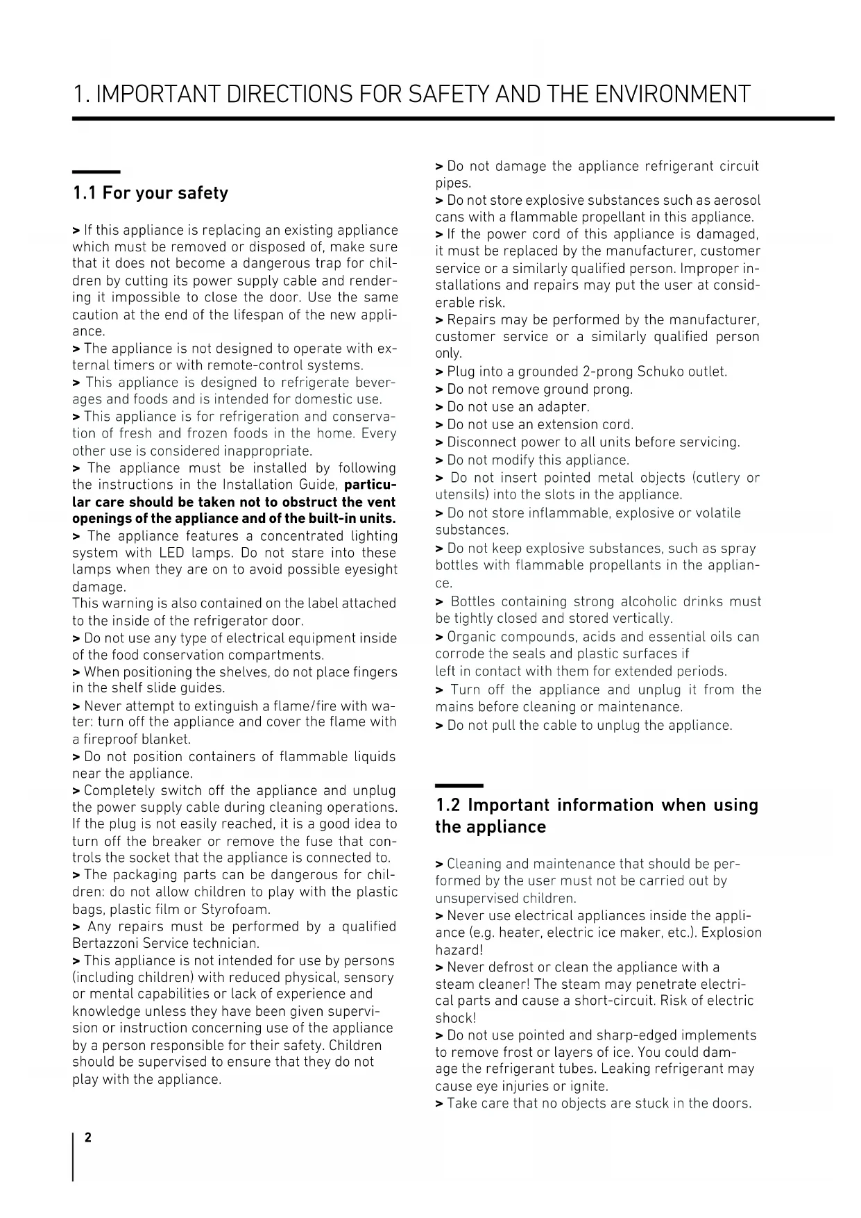 > If this appliance is replacing an existing appliance which must be removed or disposed of, make sure that it does not become a dangerous trap for chil- dren by cutting its power supply cable and render- ing it impossible to close the door. Use the same caution at the end of the lifespan of the new appli- ance. > The appliance is not designed to operate with ex- ternal timers or with remote-control systems. > This appliance is designed to refrigerate bever- ages and foods and is intended for domestic use. > This appliance is for refrigeration and conserva- tion of fresh and frozen foods in the home. Every other use is considered inappropriate. > The appliance must be installed by following the instructions in the Installation Guide, particu- lar care should be taken not to obstruct the vent openings of the appliance and of the built-in units. > The appliance features a concentrated lighting system with LED lamps. Do not stare into these lamps when they are on to avoid possible eyesight damage. This warning is also contained on the label attached to the inside of the refrigerator door. > Do not use any type of electrical equipment inside of the food conservation compartments. > When positioning the shelves, do not place fingers in the shelf slide guides. > Never attempt to extinguish a flame/fire with wa- ter: turn o the appliance and cover the flame with a fireproof blanket. > Do not position containers of flammable liquids near the appliance. > Completely switch o the appliance and unplug the power supply cable during cleaning operations. If the plug is not easily reached, it is a good idea to turn o the breaker or remove the fuse that con- trols the socket that the appliance is connected to. > The packaging parts can be dangerous for chil- dren: do not allow children to play with the plastic bags, plastic film or Styrofoam. > Any repairs must be performed by a qualified Bertazzoni Service technician. > This appliance is not intended for use by persons (including children) with reduced physical, sensory or mental capabilities or lack of experience and knowledge unless they have been given supervi- sion or instruction concerning use of the appliance by a person responsible for their safety. Children should be supervised to ensure that they do not play with the appliance. > Do not damage the appliance refrigerant circuit pipes. > Do not store explosive substances such as aerosol cans with a flammable propellant in this appliance. > If the power cord of this appliance is damaged, it must be replaced by the manufacturer, customer service or a similarly qualified person. Improper in- stallations and repairs may put the user at consid- erable risk. > Repairs may be performed by the manufacturer, customer service or a similarly qualified person only. > Plug into a grounded 2-prong Schuko outlet. > Do not remove ground prong. > Do not use an adapter. > Do not use an extension cord. > Disconnect power to all units before servicing. > Do not modify this appliance. > Do not insert pointed metal objects (cutlery or utensils) into the slots in the appliance. > Do not store inflammable, explosive or volatile substances. > Do not keep explosive substances, such as spray bottles with flammable propellants in the applian- ce. > Bottles containing strong alcoholic drinks must be tightly closed and stored vertically. > Organic compounds, acids and essential oils can corrode the seals and plastic surfaces if left in contact with them for extended periods. > Turn o the appliance and unplug it from the mains before cleaning or maintenance. > Do not pull the cable to unplug the appliance.