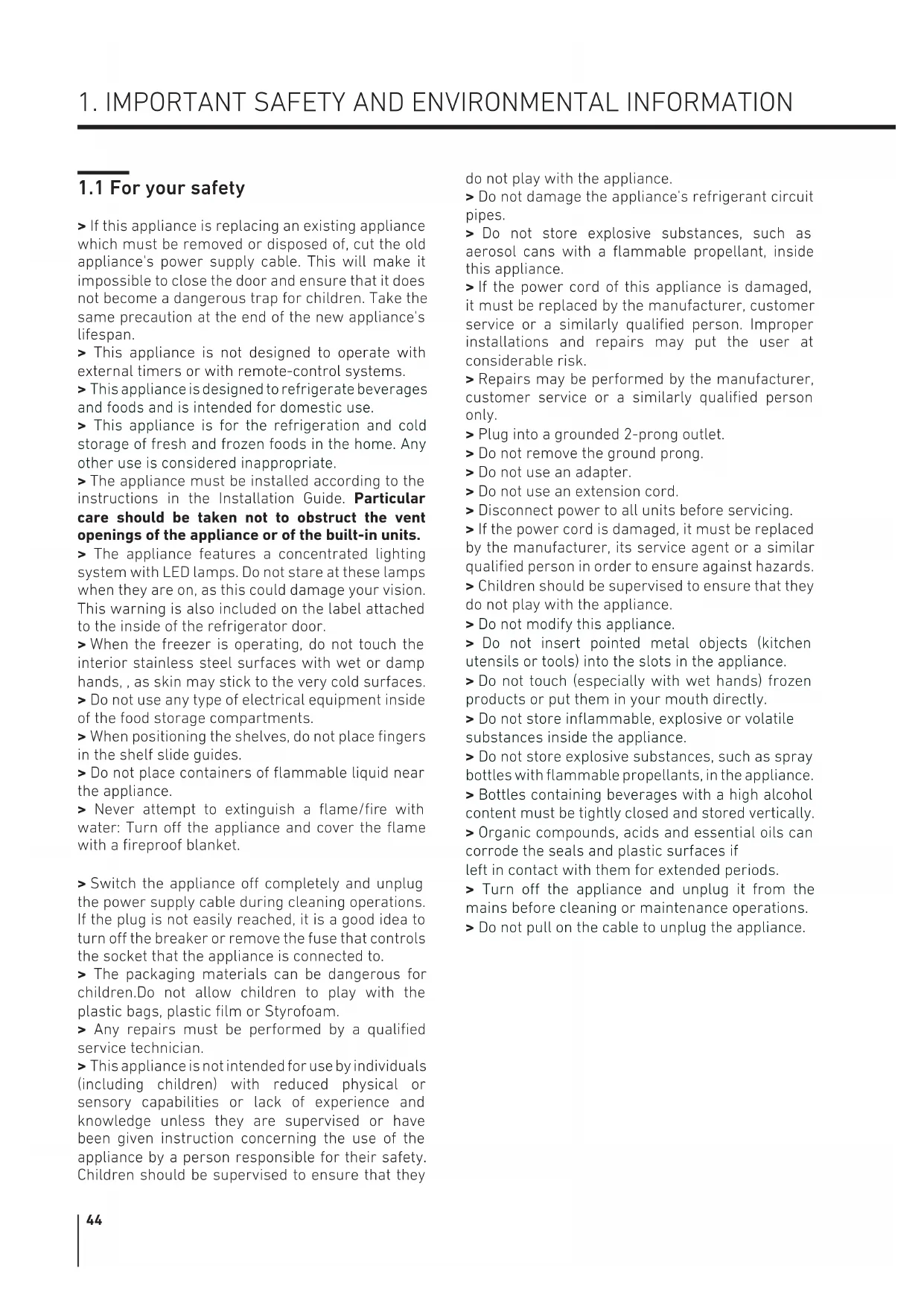 > If this appliance is replacing an existing appliance which must be removed or disposed of, cut the old appliance's power supply cable. This will make it impossible to close the door and ensure that it does not become a dangerous trap for children. Take the same precaution at the end of the new appliance's lifespan. > This appliance is not designed to operate with external timers or with remote-control systems. > This appliance is designed to refrigerate beverages and foods and is intended for domestic use. > This appliance is for the refrigeration and cold storage of fresh and frozen foods in the home. Any other use is considered inappropriate. > The appliance must be installed according to the instructions in the Installation Guide. Particular care should be taken not to obstruct the vent openings of the appliance or of the built-in units. > The appliance features a concentrated lighting system with LED lamps. Do not stare at these lamps when they are on, as this could damage your vision. This warning is also included on the label attached to the inside of the refrigerator door. > When the freezer is operating, do not touch the interior stainless steel surfaces with wet or damp hands, , as skin may stick to the very cold surfaces. > Do not use any type of electrical equipment inside of the food storage compartments. > When positioning the shelves, do not place fingers in the shelf slide guides. > Do not place containers of flammable liquid near the appliance. > Never attempt to extinguish a flame/fire with water: Turn o the appliance and cover the flame with a fireproof blanket. > Switch the appliance o completely and unplug the power supply cable during cleaning operations. If the plug is not easily reached, it is a good idea to turn o the breaker or remove the fuse that controls the socket that the appliance is connected to. > The packaging materials can be dangerous for children.Do not allow children to play with the plastic bags, plastic film or Styrofoam. > Any repairs must be performed by a qualified service technician. > This appliance is not intended for use by individuals (including children) with reduced physical or sensory capabilities or lack of experience and knowledge unless they are supervised or have been given instruction concerning the use of the appliance by a person responsible for their safety. Children should be supervised to ensure that they do not play with the appliance. > Do not damage the appliance's refrigerant circuit pipes. > Do not store explosive substances, such as aerosol cans with a flammable propellant, inside this appliance. > If the power cord of this appliance is damaged, it must be replaced by the manufacturer, customer service or a similarly qualified person. Improper installations and repairs may put the user at considerable risk. > Repairs may be performed by the manufacturer, customer service or a similarly qualified person only. > Plug into a grounded 2-prong outlet. > Do not remove the ground prong. > Do not use an adapter. > Do not use an extension cord. > Disconnect power to all units before servicing. > If the power cord is damaged, it must be replaced by the manufacturer, its service agent or a similar qualified person in order to ensure against hazards. > Children should be supervised to ensure that they do not play with the appliance. > Do not modify this appliance. > Do not insert pointed metal objects (kitchen utensils or tools) into the slots in the appliance. > Do not touch (especially with wet hands) frozen products or put them in your mouth directly. > Do not store inflammable, explosive or volatile substances inside the appliance. > Do not store explosive substances, such as spray bottles with flammable propellants, in the appliance. > Bottles containing beverages with a high alcohol content must be tightly closed and stored vertically. > Organic compounds, acids and essential oils can corrode the seals and plastic surfaces if left in contact with them for extended periods. > Turn o the appliance and unplug it from the mains before cleaning or maintenance operations. > Do not pull on the cable to unplug the appliance.