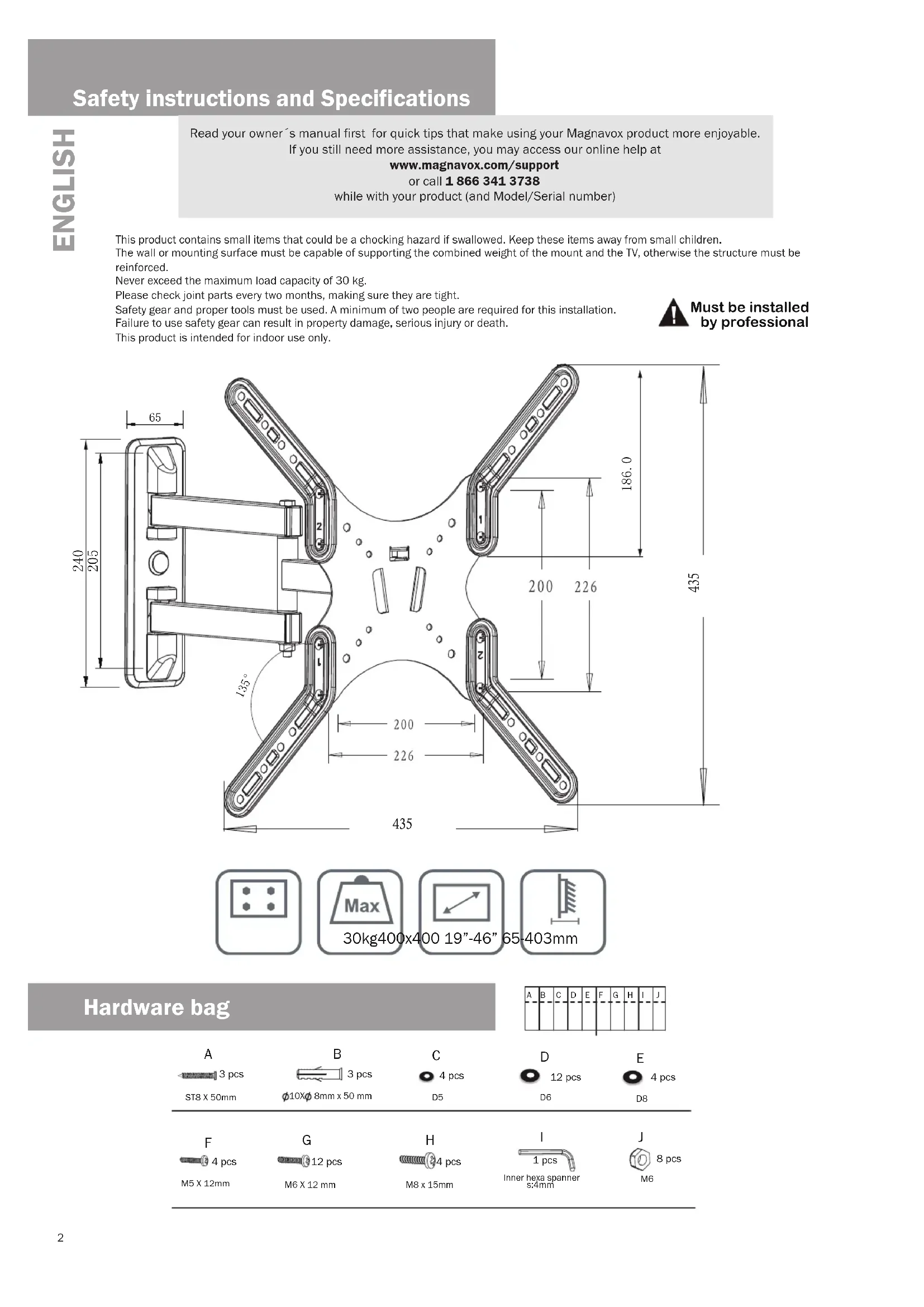 19”- 46”Safety instructions and Specifications Read your owner´s manual first for quick tips that make using your Magnavox product more enjoyable.If you still need more assistance, you may access our online help atwww.magnavox.com/support or call 1 866 341 3738 while with your product (and Model/Serial number) This product contains small items that could be a chocking hazard if swallowed. Keep these items away from small children. The wall or mounting surface must be capable of supporting the combined weight of the mount and the TV, otherwise the structure must be reinforced.Never exceed the maximum load capacity of 30 kg.Please check joint parts every two months, making sure they are tight.Safety gear and proper tools must be used. A minimum of two people are required for this installation.Failure to use safety gear can result in property damage, serious injury or death.This product is intended for indoor use only. Must be installed by professional