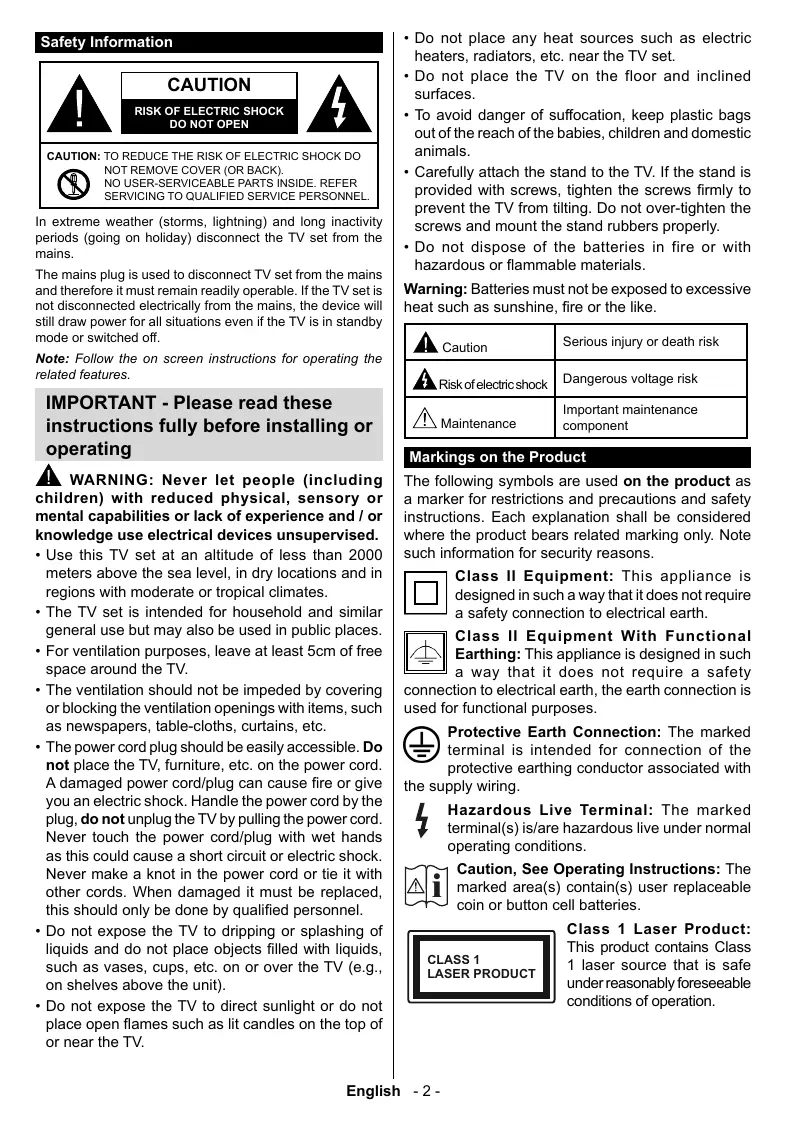 éclaboussures de liquide et ne posez pas d’objets contenant du liquide tels que les vases, les tasses, etc. sur ou au-dessus du téléviseur (par exemple sur les étagères au-dessus de l’appareil). • N’exposez pas le téléviseur à la lumière directe du soleil ou ne placez/dirigez pas des flammes nues telles que les bougies allumées au-dessus ou à proximité du téléviseur. • Ne placez pas des sources de chaleur telles que les chauffages électriques, les radiateurs, etc. à proximité du téléviseur. • Ne posez pas le téléviseur à même le sol et sur des surfaces inclinées. • Pour éviter des risques de suffocation, tenez les sacs plastiques hors de la portée des bébés, enfants et des animaux domestiques. • Fixez soigneusement le support au téléviseur. Si le support est fourni avec des vis, serrez-les fermement pour éviter que le téléviseur ne s’incline. Ne serrez pas trop les vis et montez convenablement les supports en caoutchouc. • N'éliminez pas les batteries dans le feu ou avec des matériaux dangereux ou inflammables. Avertissement : N'exposez pas les piles à une chaleur excessive telle que celle du soleil, du feu ou autre. Mise en garde Risque d'électrocution Entretien