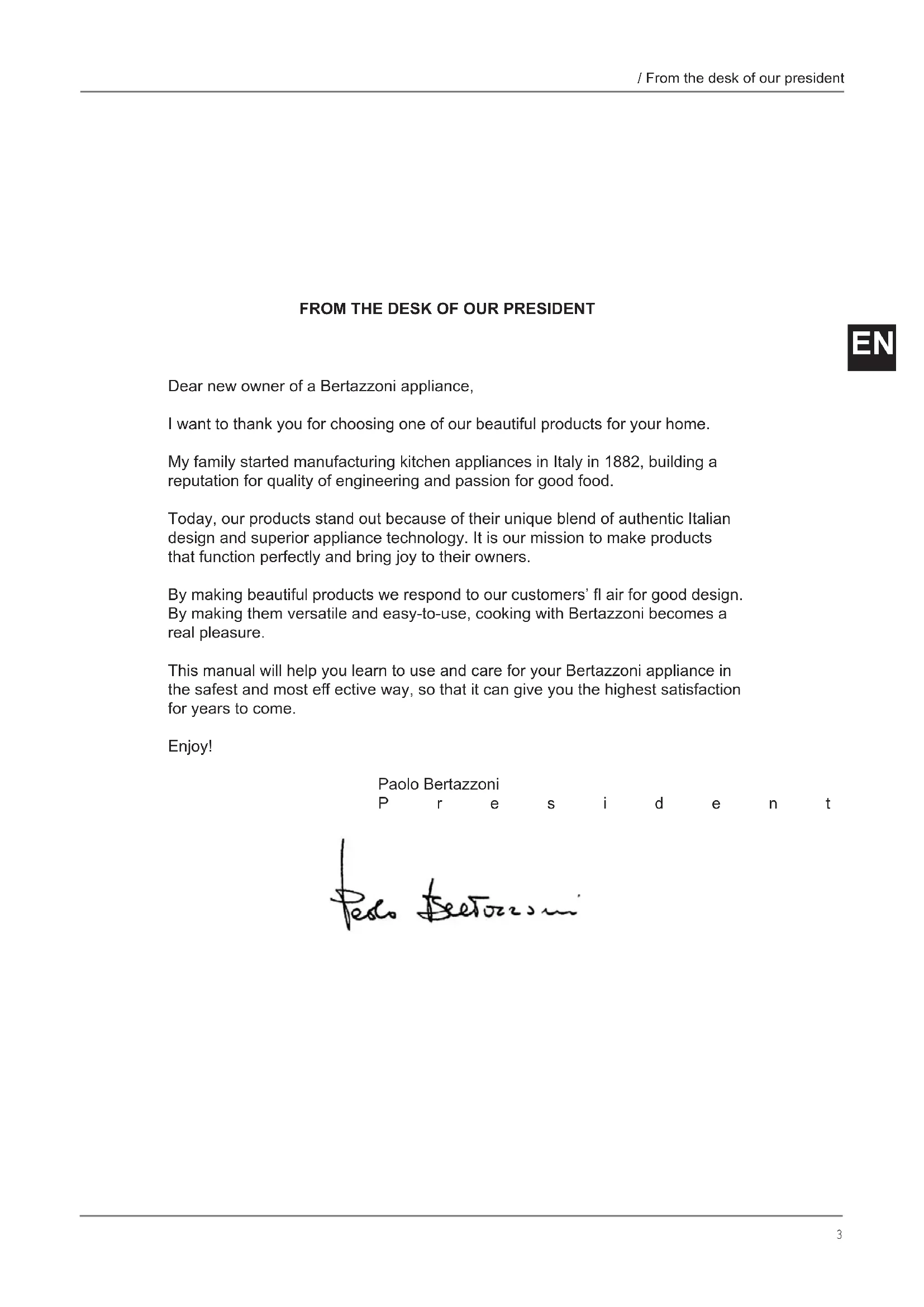 Dear new owner of a Bertazzoni appliance, I want to thank you for choosing one of our beautiful products for your home. My family started manufacturing kitchen appliances in Italy in 1882, building a reputation for quality of engineering and passion for good food. Today, our products stand out because of their unique blend of authentic Italian design and superior appliance technology. It is our mission to make products that function perfectly and bring joy to their owners. By making beautiful products we respond to our customers’ fl air for good design. By making them versatile and easy-to-use, cooking with Bertazzoni becomes a real pleasure. This manual will help you learn to use and care for your Bertazzoni appliance in the safest and most eff ective way, so that it can give you the highest satisfaction for years to come. Enjoy! Paolo Bertazzoni President4