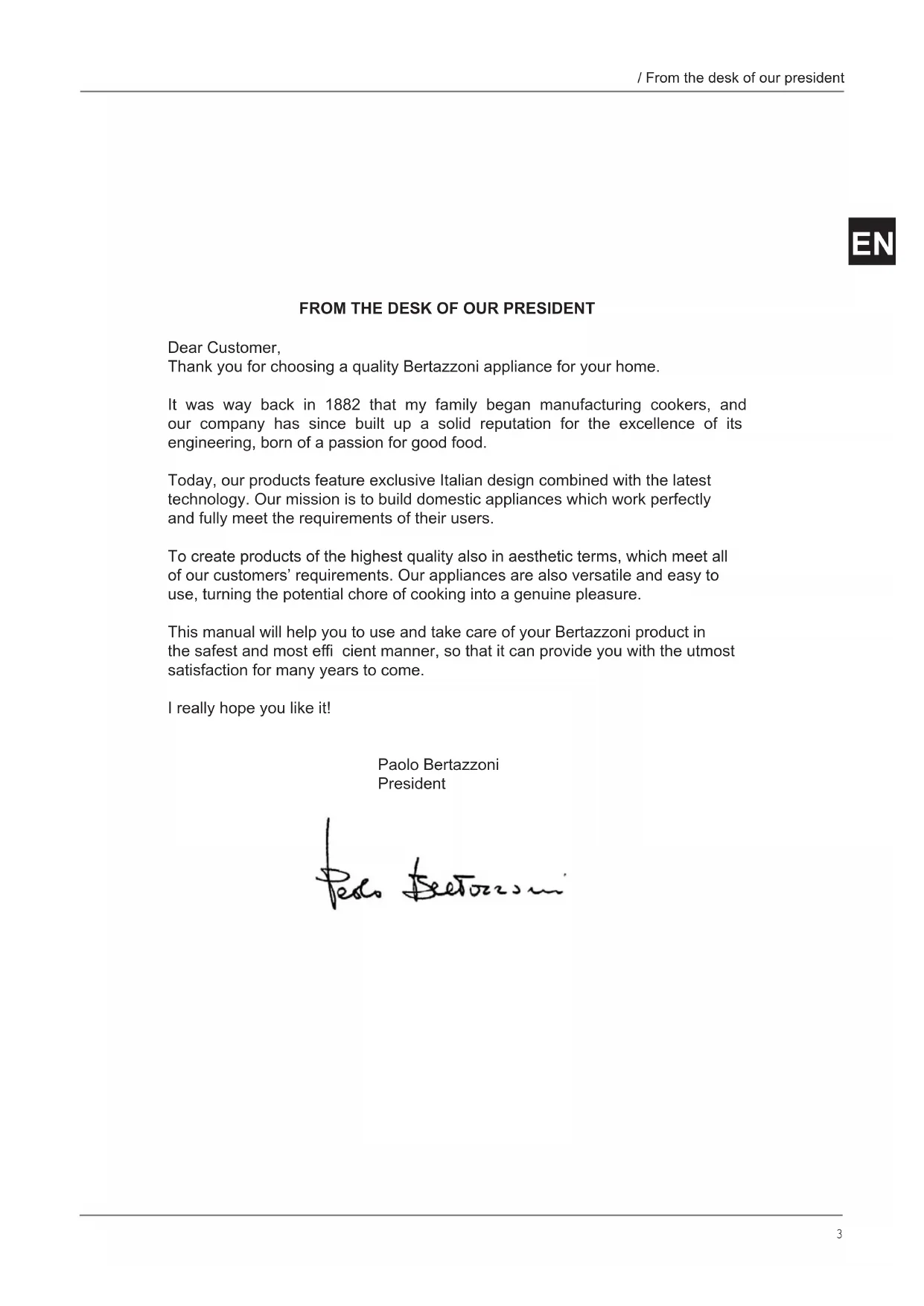 Dear Customer, Thank you for choosing a quality Bertazzoni appliance for your home. It was way back in 1882 that my family began manufacturing cookers, and our company has since built up a solid reputation for the excellence of its engineering, born of a passion for good food. Today, our products feature exclusive Italian design combined with the latest technology. Our mission is to build domestic appliances which work perfectly and fully meet the requirements of their users. To create products of the highest quality also in aesthetic terms, which meet all of our customers’ requirements. Our appliances are also versatile and easy to use, turning the potential chore of cooking into a genuine pleasure. This manual will help you to use and take care of your Bertazzoni product in the safest and most effi cient manner, so that it can provide you with the utmost satisfaction for many years to come. I really hope you like it! Paolo Bertazzoni President4