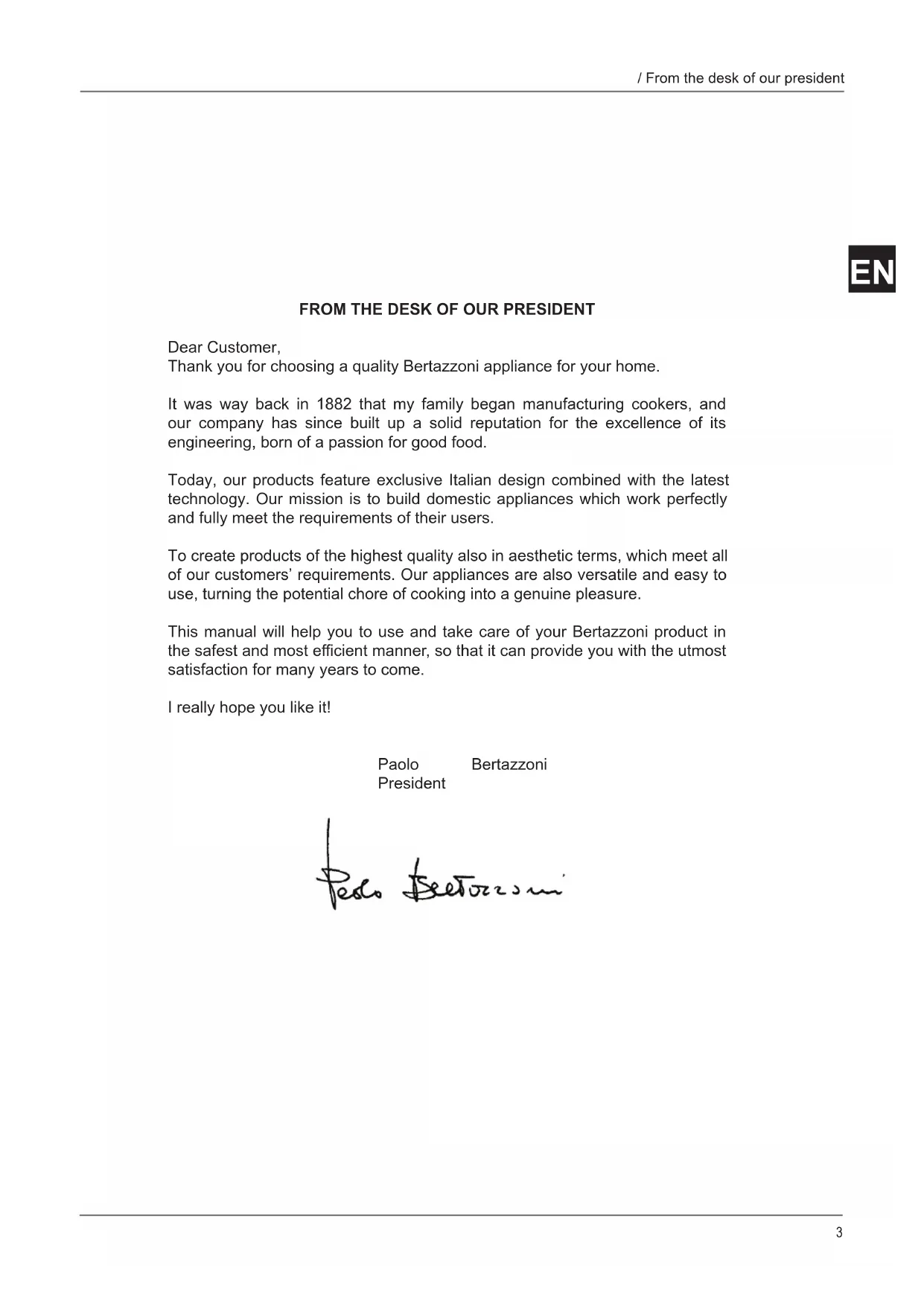 Dear Customer, Thank you for choosing a quality Bertazzoni appliance for your home. It was way back in 1882 that my family began manufacturing cookers, and our company has since built up a solid reputation for the excellence of its engineering, born of a passion for good food. Today, our products feature exclusive Italian design combined with the latest technology. Our mission is to build domestic appliances which work perfectly and fully meet the requirements of their users. To create products of the highest quality also in aesthetic terms, which meet all of our customers’ requirements. Our appliances are also versatile and easy to use, turning the potential chore of cooking into a genuine pleasure. This manual will help you to use and take care of your Bertazzoni product in the safest and most effi cient manner, so that it can provide you with the utmost satisfaction for many years to come. I really hope you like it! Paolo Bertazzoni President4