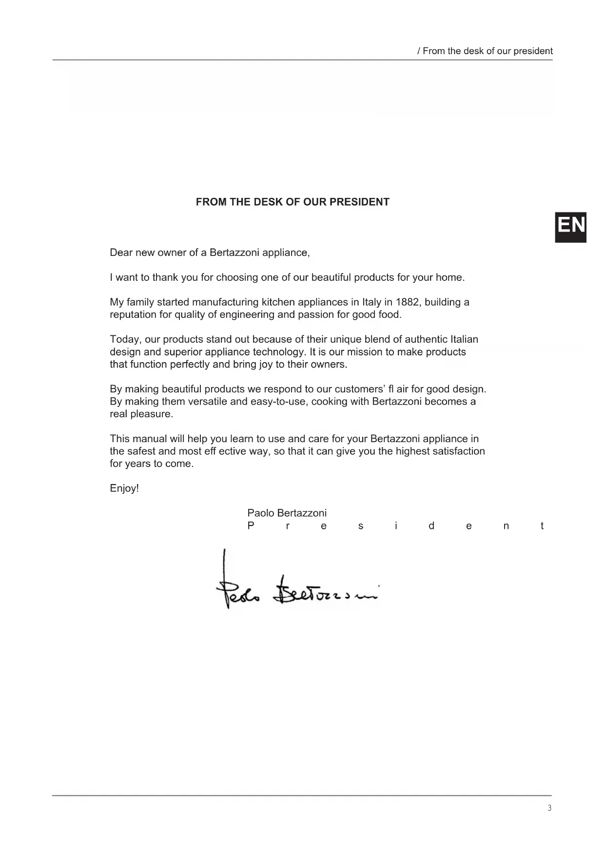 Dear new owner of a Bertazzoni appliance, I want to thank you for choosing one of our beautiful products for your home. My family started manufacturing kitchen appliances in Italy in 1882, building a reputation for quality of engineering and passion for good food. Today, our products stand out because of their unique blend of authentic Italian design and superior appliance technology. It is our mission to make products that function perfectly and bring joy to their owners. By making beautiful products we respond to our customers’ fl air for good design. By making them versatile and easy-to-use, cooking with Bertazzoni becomes a real pleasure. This manual will help you learn to use and care for your Bertazzoni appliance in the safest and most eff ective way, so that it can give you the highest satisfaction for years to come. Enjoy! Paolo Bertazzoni President4