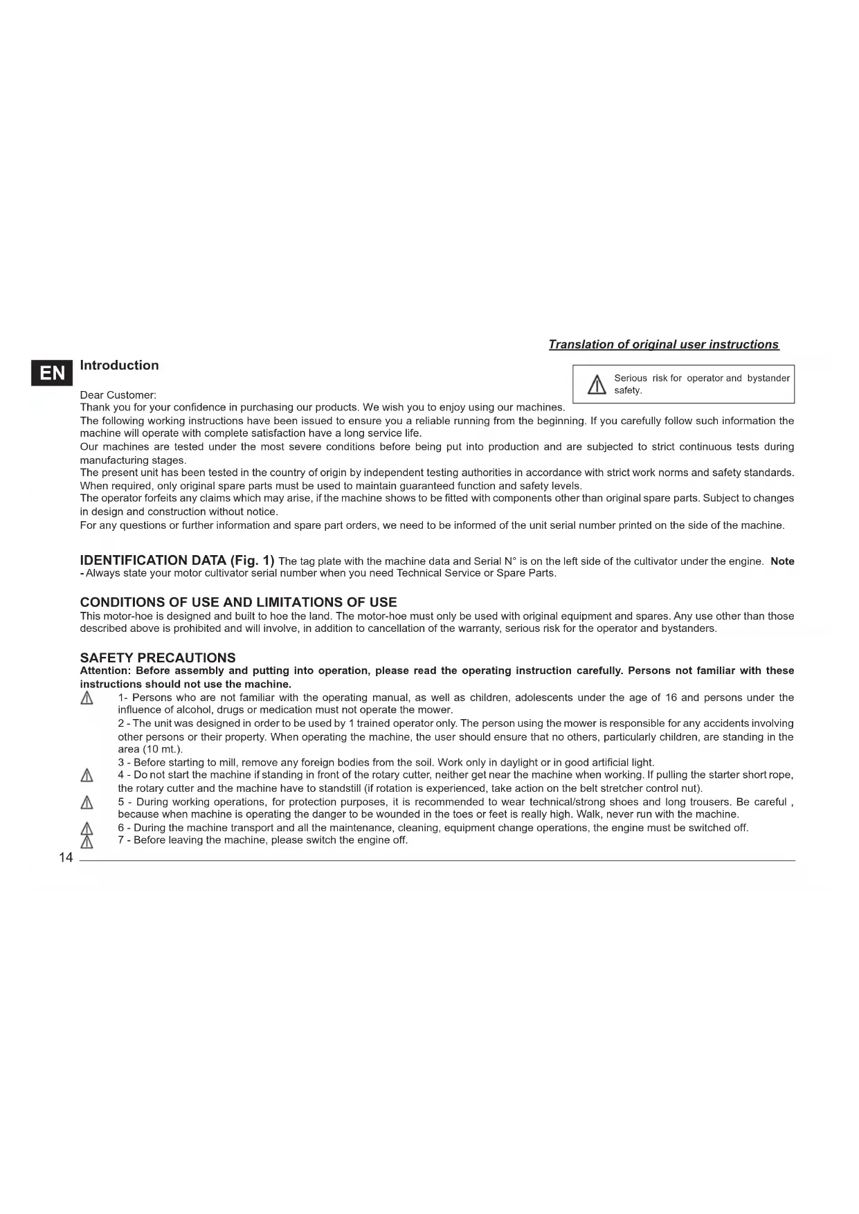 4 - Do not start the machine if standing in front of the rotary cutter, neither get near the machine when working. If pulling the starter short rope, the rotary cutter and the machine have to standstill (if rotation is experienced, take action on the belt stretcher control nut). 5 - During working operations, for protection purposes, it is recommended to wear technical/strong shoes and long trousers. Be careful , because when machine is operating the danger to be wounded in the toes or feet is really high. Walk, never run with the machine. 6 - During the machine transport and all the maintenance, cleaning, equipment change operations, the engine must be switched off.