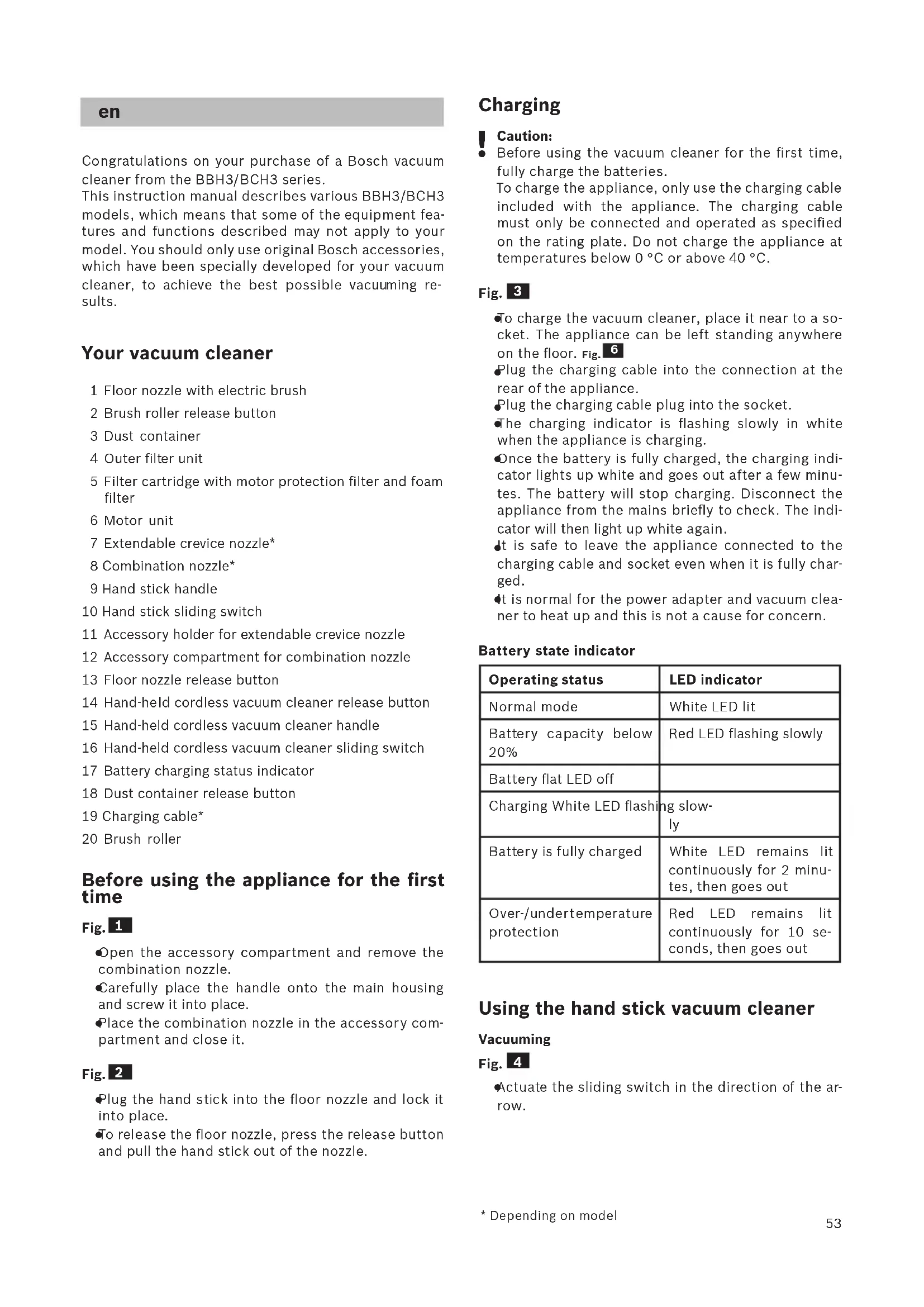 Congratulations on your purchase of a Bosch vacuum cleaner from the BBH3/BCH3 series. This instruction manual describes various BBH3/BCH3 mode ls, which means that some of the equipment fea- tures and functions described may not apply to your mode l. You should only use original Bosch accessories, which have been specially developed for your vacuum cleaner, to achieve the best possible vacuu ming re- sults. Your vacuum cleaner 1 Floor nozzle with electric brush 2 Brush roller release button 3 Dust container 4 Outer filter unit 5 Filter cartridge with motor protection filter and foam filter 6 Motor unit 7 Extendable crevice nozzle* 8 Combination nozzle* 9 Hand stick handle 10 Hand stick sliding switch 11 Accessory holder for extendable crevice nozzle 12 Accessory compartment for combination nozzle 13 Floor nozzle release button 14 Hand-he ld cordless vacuum cleaner release button 15 Hand-held cordless vacuum cleaner handle 16 Hand-held cordless vacuum cleaner sliding switch 17 Battery charging status indicator 18 Dust container release button 19 Charging cable* 20 Brush roller Before using the appliance for the first time Fig.