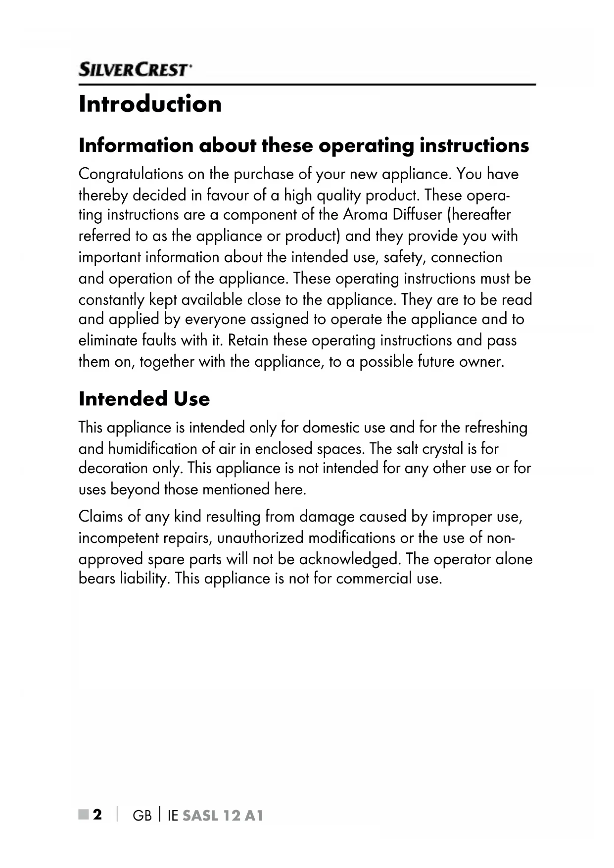 Introduction Information about these operating instructions Congratulations on the purchase of your new appliance. You have thereby decided in favour of a high quality product. These opera- ting instructions are a component of the Aroma Diffuser (hereafter referred to as the appliance or product) and they provide you with important information about the intended use, safety, connection and operation of the appliance. These operating instructions must be constantly kept available close to the appliance. They are to be read and applied by everyone assigned to operate the appliance and to eliminate faults with it. Retain these operating instructions and pass them on, together with the appliance, to a possible future owner. Intended Use This appliance is intended only for domestic use and for the refreshing and humidification of air in enclosed spaces. The salt crystal is for decoration only. This appliance is not intended for any other use or for uses beyond those mentioned here. Claims of any kind resulting from damage caused by improper use, incompetent repairs, unauthorized modifications or the use of non- approved spare parts will not be acknowledged. The operator alone bears liability. This appliance is not for commercial use.GB