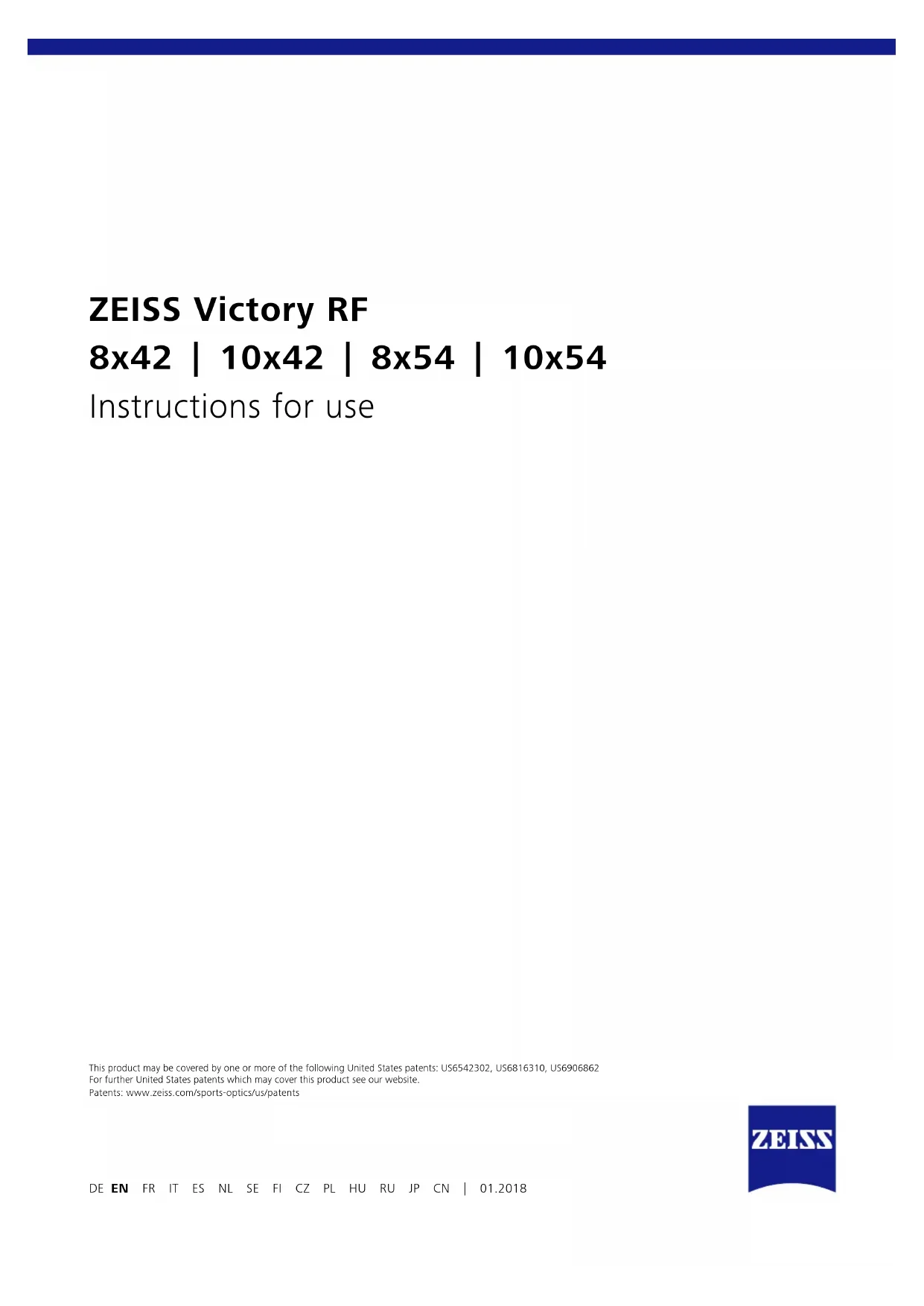 - Accessories are not included in the scope of supply! ZEISS is a byword for reliability and a high level of quality. Therefore, quite independently of the seller’s warranty obligations to the customer, we the manufacturer offer a ten year guarantee on this ZEISS product. The scope of the guarantee can be seen by accessing the following link: www.zeiss.com/sports-optics/premium-warranty-conditions For US, please follow this link: www.zeiss.com/sports-optics/us-warranty-conditions Register your product at: www.zeiss.com/sports-optics/registration Subject to changes in design and scope of supply due to technical improvements. No liability for mistakes and printing errors. Carl Zeiss Sports Optics GmbH ZEISS Group Gloelstraße 3 – 5 35576 Wetzlar Germany www.zeiss.com/sports-optics Fig. 18 Fig. 19 Fig. 20ZEISS Victory RF 8x42 | 10x42 | 8x54 | 10x54 Mode d’emploi DE EN FR IT ES NL SE FI CZ PL HU RU JP CN | 01.2018 This product may be covered by one or more of the following United States patents: US6542302, US6816310, US6906862 For further United States patents which may cover this product see our website. Patents: www.zeiss.com/sports-optics/us/patents2 | 7 FR