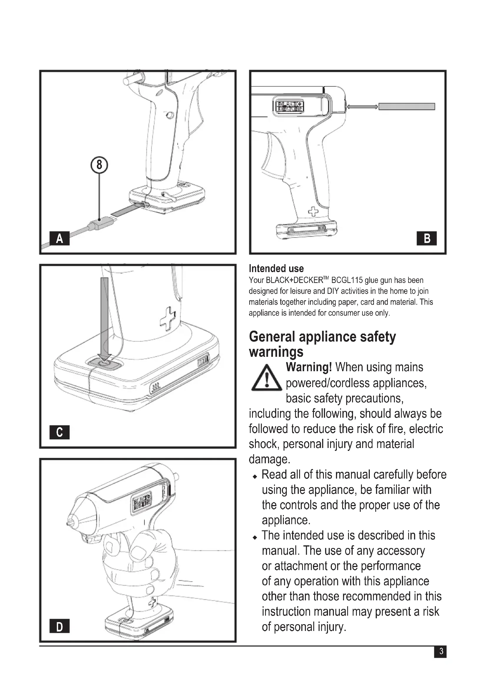 BCGL115 glue gun has been designed for leisure and DIY activities in the home to join materials together including paper, card and material. This appliance is intended for consumer use only. General appliance safety warnings Warning! When using mains powered/cordless appliances, basic safety precautions, including the following, should always be followed to reduce the risk of re, electric shock, personal injury and material damage. u Read all of this manual carefully before using the appliance, be familiar with the controls and the proper use of the appliance. u The intended use is described in this manual. The use of any accessory or attachment or the performance of any operation with this appliance other than those recommended in this instruction manual may present a risk of personal injury.