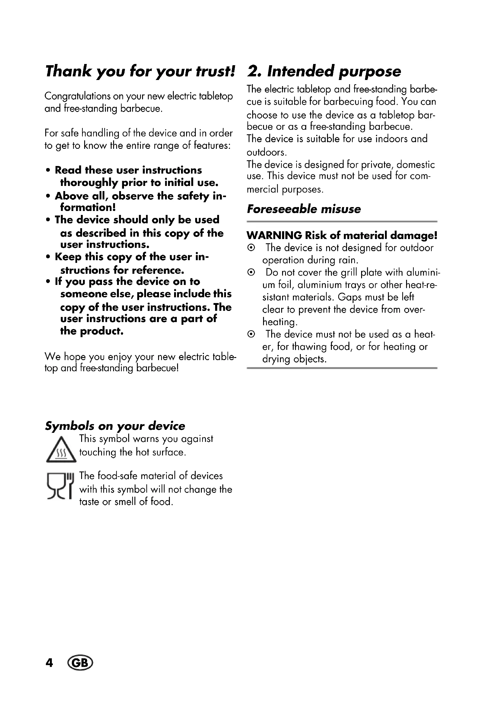 - If you pass the device on to someone else, please include this copy of the user instructions. The user instructions are a part of the product. We hope you enjoy your new electric table- top and free-standing barbecue! Symbols on your device This symbol warns you against touching the hot surface. The food-safe material of devices with this symbol will not change the taste or smell of food.
