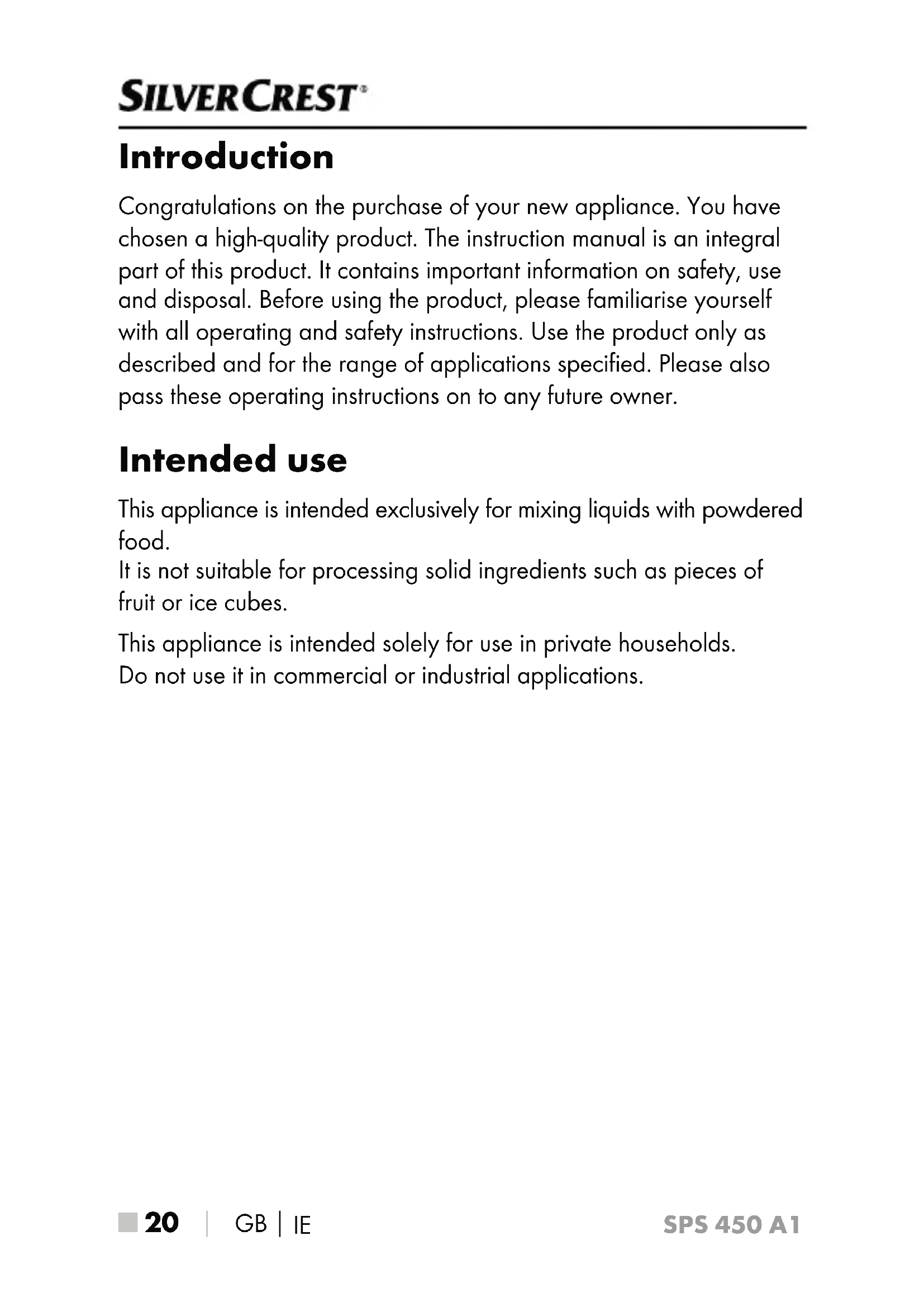 Congratulations on the purchase of your new appliance. You have chosen a high-quality product. The instruction manual is an integral part of this product. It contains important information on safety, use and disposal. Before using the product, please familiarise yourself with all operating and safety instructions. Use the product only as described and for the range of applications specified. Please also pass these operating instructions on to any future owner.