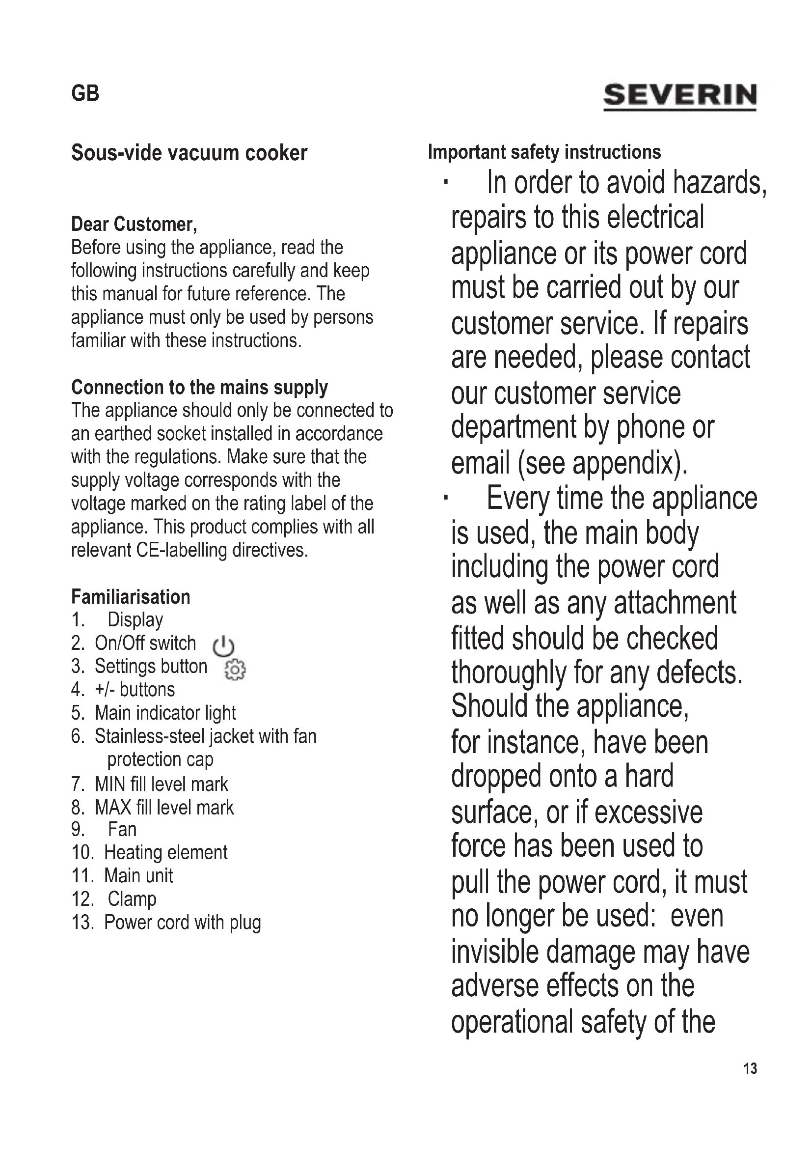 Sous-vide vacuum cooker Dear Customer, Before using the appliance, read the following instructions carefully and keep this manual for future reference. The appliance must only be used by persons familiar with these instructions. Connection to the mains supply The appliance should only be connected to an earthed socket installed in accordance with the regulations. Make sure that the supply voltage corresponds with the voltage marked on the rating label of the appliance. This product complies with all relevant CE-labelling directives. Familiarisation