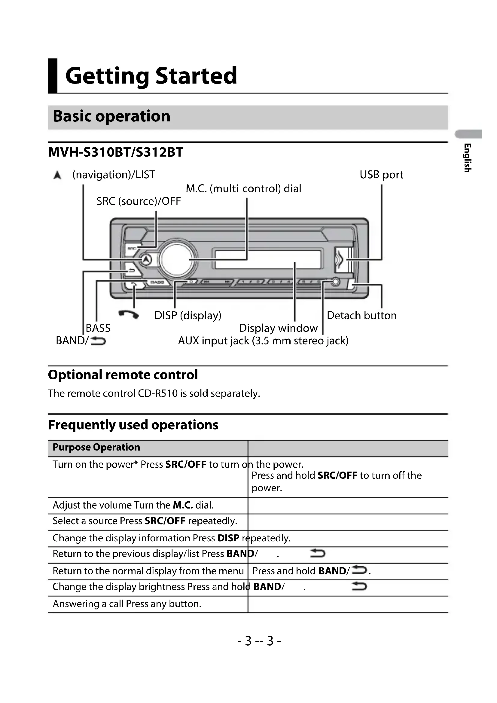 Optional remote control The remote control CD-R510 is sold separately. Frequently used operations Getting Started Basic operation Purpose OperationTurn on the power* Press SRC/OFF to turn on the power.Press and hold SRC/OFF to turn off the power.Adjust the volume Turn the M.C. dial.Select a source Press SRC/OFF repeatedly.Change the display information Press DISP repeatedly.Return to the previous display/list Press BAND/. Return to the normal display from the menu Press and hold BAND/. Change the display brightness Press and hold BAND/.Answering a call Press any button. Detach button Display window BAND/ DISP (display) (navigation)/LIST USB port AUX input jack (3.5 mm stereo jack) M.C. (multi-control) dial SRC (source)/OFF BASS- 4 - English