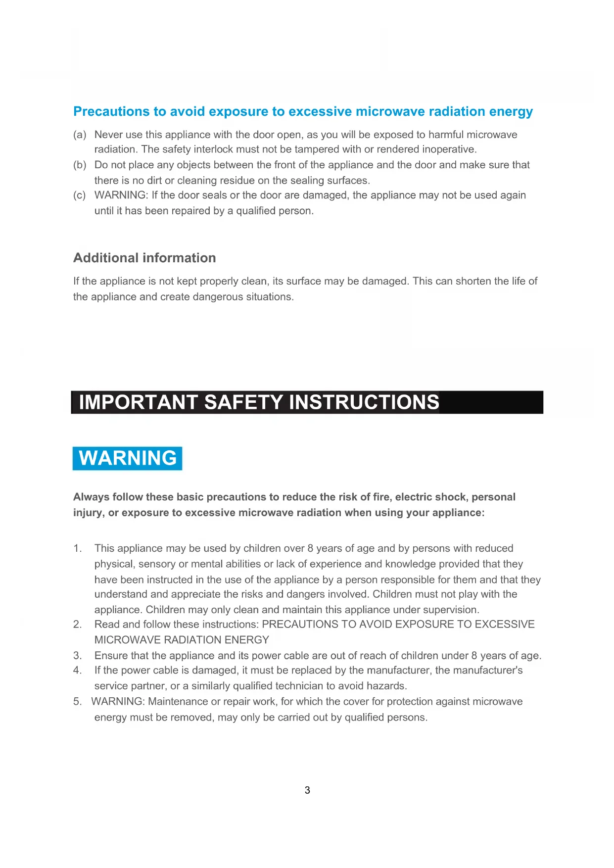 33 Saving energy 33 Environmentally friendly disposal3 Precautions to avoid exposure to excessive microwave radiation energy (a) Never use this appliance with the door open, as you will be exposed to harmful microwave radiation. The safety interlock must not be tampered with or rendered inoperative. (b) Do not place any objects between the front of the appliance and the door and make sure that there is no dirt or cleaning residue on the sealing surfaces. (c) WARNING: If the door seals or the door are damaged, the appliance may not be used again until it has been repaired by a qualified person.