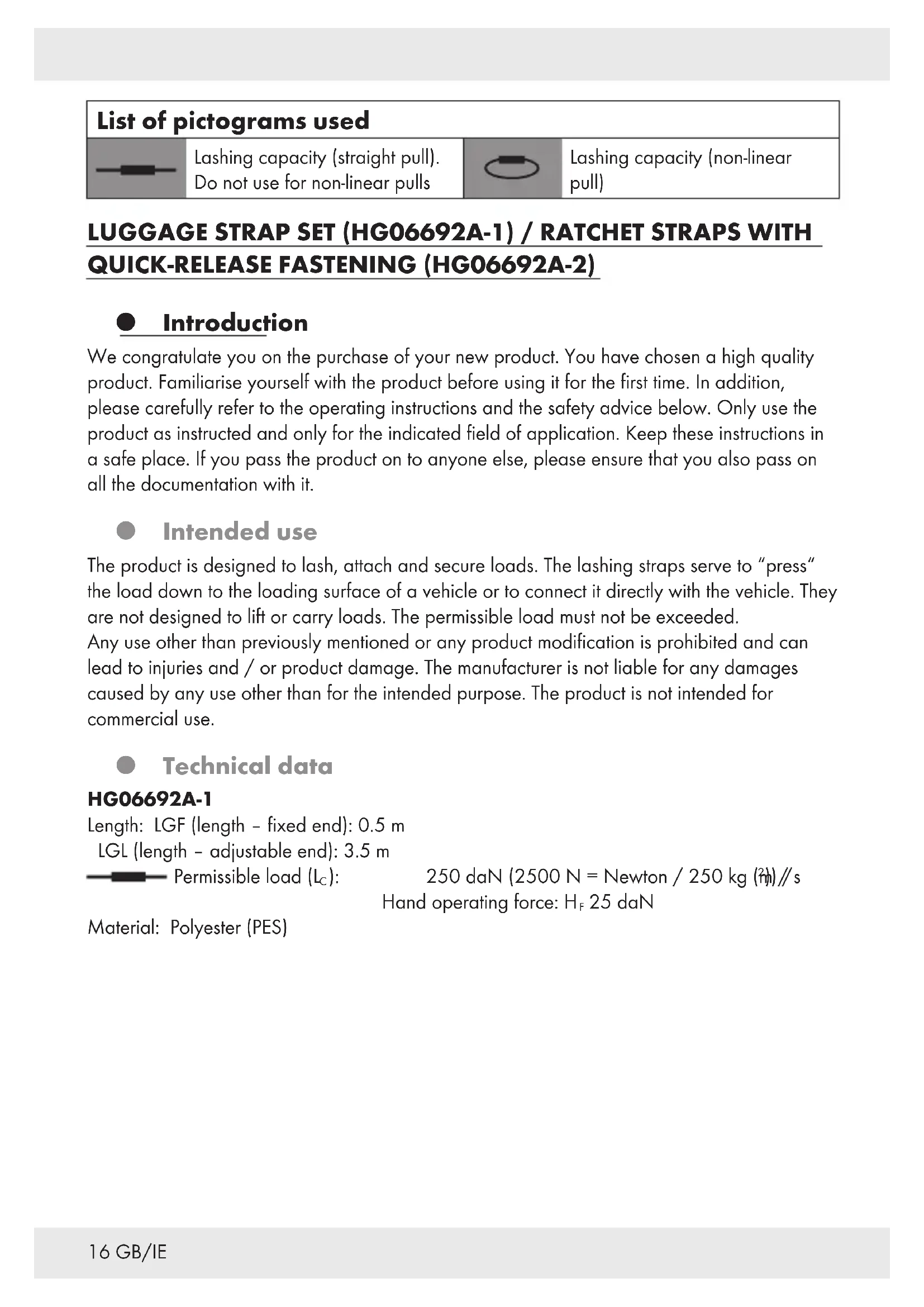 Looped: 250 daN Material: Polyester (PES) Scope of delivery Check the delivery for completeness and condition of the product immediately after opening and ensure all parts are included. 2 x Lashing strap with ratchet tensioner and S hook, approx. 0.5 m (HG06692A-1) 2 x Lashing strap with S-hook, approx. 3.5 m (HG06692A-1) 2 x Lashing straps with clamping lock, approx. 2.5 m (HG06692A-2) 1 x Directions for use Safety instructions KEEP ALL THE SAFETY ADVICE AND INSTRUCTIONS IN A SAFE PLACE FOR FUTURE REFERENCE! General safety instructions WARNING! DANGER TO LIFE AND RISK OF ACCIDENTS FOR INFANTS AND CHILDREN! Never leave children unattended with the packaging material. The packaging poses a risk of suffocation and danger of life due to strangulation. Children often underestimate this danger. Always keep children away from this product. This product is not a toy. Do not use the product if you see it is damaged in any way. Check that all parts have been assembled correctly. Improper assembly may result in injury. Safety instructions for lashing straps Always check the lashing strap for damage before using it. On no account use the lashing strap if the strap is damaged. Carefully check dirty straps or straps that have been contaminated with corrosive or other materials that may damage them. You may have to ask the manufacturer to check them.18 GB/IE Have the lashing straps and all components checked by an expert at least once a year. In accordance with the conditions of use and the operational circumstances, further checks by a professional may be necessary from time to time. On no account use the lashing strap if: – there are broken threads or cuts in the thread, especially if the edges have been nicked or there are other alarming cases of damage – the labelling is missing or is no longer legible – there is damage to the connections, or deformation due to exposure to heat (friction, radiation) – there is damage due to the effect of corrosive substances. On no account use the ratchets if: – there are incipient tears, breakages or considerable cases of or damage from corrosion – there is widening > 5 % (5 % in the hook mouth or general deformation) – there is visibly permanent deformation of load-bearing parts Repairs to the lashing straps may only be carried out if the information regarding the manufacturer, material and maximum permissible tensile load is clearly designated on the label. They may only be carried out by the manufacturer or a person specified by him. Following repair, the manufacturer or the person designated by the manufacturer must ensure that the maximum permissible tensile load of the lashing straps as originally specified on the label is maintained. Never exceed the permissible tensile load of the lashing strap as stated on the label (see also “Technical data”). Choose the most suitable lashing strap in accordance with the intended load that needs to be lashed down, the tensile load and loading surface (see label). m CAUTION! DANGER OF ACCIDENT! When lashing using additional fittings and lashing devices, make sure that they are suitable for the lashing strap. Check that the vehicle parts you wish to strap the load to are sturdy enough. m CAUTION! In addition to the accelerating forces, wind may cause lateral forces to arise during the journey. Never pull the lashing strap over rough surfaces or sharp edges if they are not furnished with suitable protection. Make sure that the lashing straps are not twisted and that the load is distributed across their entire width. Do not place any objects onto the lashing strap if this may damage it.19 GB/IE Keep lashing strap away from hot surfaces. Evenly distribute the lashing straps on the load to be secured. Never use the lashing straps to lift loads. Make sure you do not put any load on the tip of the S hook unless it is a hook that is designed for such a purpose. To avoid detachment of a lashing hook without a lock in a lashing point on the loading surface, suspend from the inside outwards. Never attach S hooks and ratchets to edges. Never extend the ratchet handle to achieve greater tensioning forces if this is not expressly allowed by an instruction. m CAUTION! DANGER OF ACCIDENT! Always choose suitable lashing straps, lashing points and lashing methods. The size, shape and weight of the cargo as well as the intended mode of use, the transport environment and the type of cargo determine the correct choice. To ensure the load is secured properly, the webbing needs to be wrapped around the ratchet at least 1.5 times. Tighten the webbing manually as far as possible so that the belt does not need to be wrapped more than 3 times around the ratchet to tighten the load. Do not exceed the roof load indicated by the vehicle manufacturer. m CAUTION! DANGER OF ACCIDENT! When lashing down, pay attention to the required preload force. At least 2 lashing straps are required. For reasons of stability, at least two lashing straps of the same kind must be used for lashing down and two pairs of lashing straps of the same kind used for diagonal lashing. m CAUTION! DANGER OF ACCIDENT! During transportation, regularly check that the cargo is correctly lashed and tighten the lashing strap if necessary. Practical information regarding the use and care of lashing straps