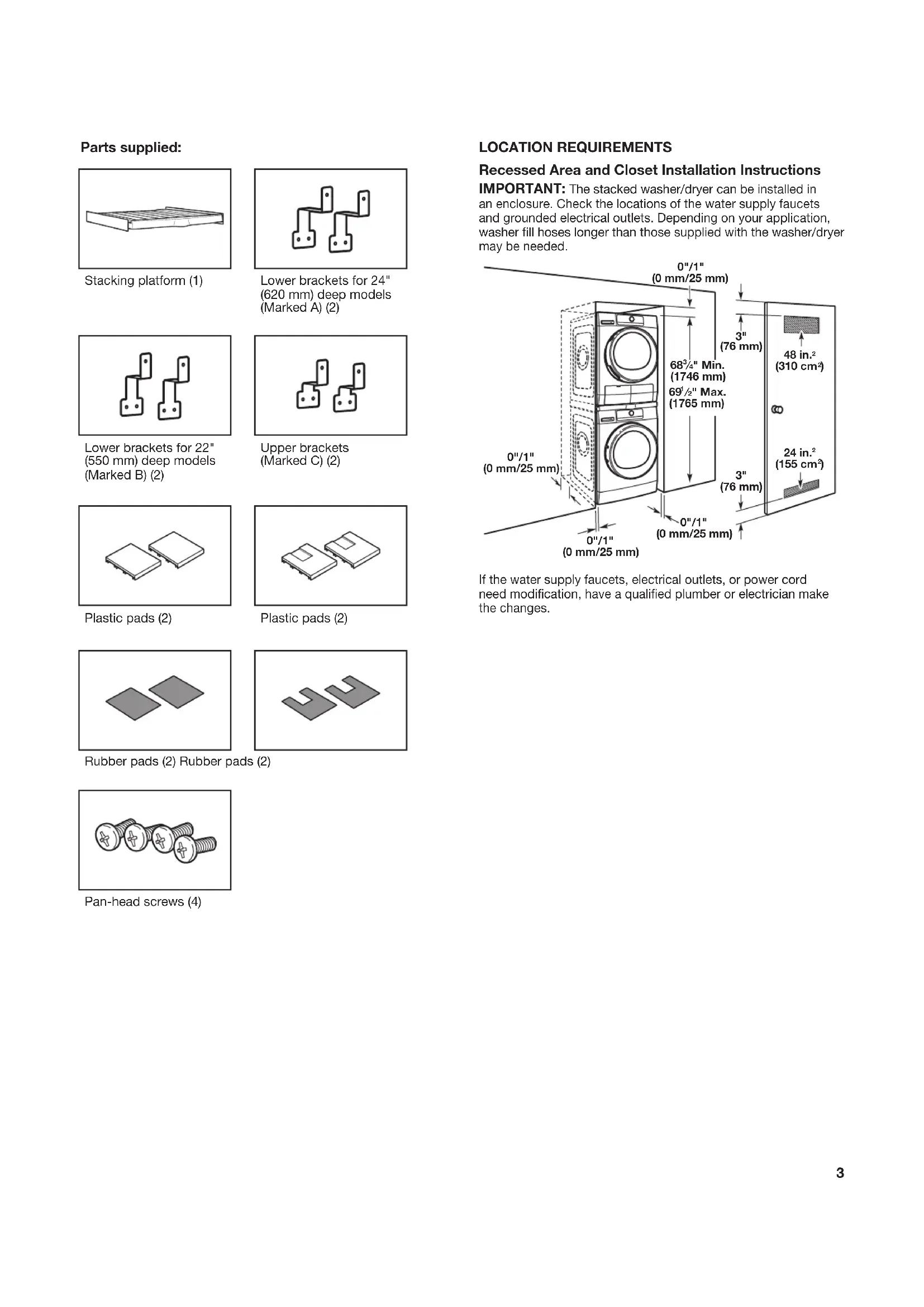 Gather the required tools and parts before starting installation. Tools needed: Phillips screwdriver Adjustable wrench that opens to 1" (25 mm) Level Pliers or slip-joint pliers (for drain and inlet hoses) Bucket Tape measure3 Parts supplied: Plastic pads (2) Lower brackets for 22" (550 mm) deep models (Marked B) (2) Pan-head screws (4) Rubber pads (2) Rubber pads (2) Lower brackets for 24" (620 mm) deep models (Marked A) (2) Upper brackets (Marked C) (2) Plastic pads (2) Stacking platform (1) LOCATION REQUIREMENTS Recessed Area and Closet Installation Instructions IMPORTANT: The stacked washer/dryer can be installed in an enclosure. Check the locations of the water supply faucets and grounded electrical outlets. Depending on your application, washer ll hoses longer than those supplied with the washer/dryer may be needed. If the water supply faucets, electrical outlets, or power cord need modication, have a qualied plumber or electrician make the changes. 24 in.